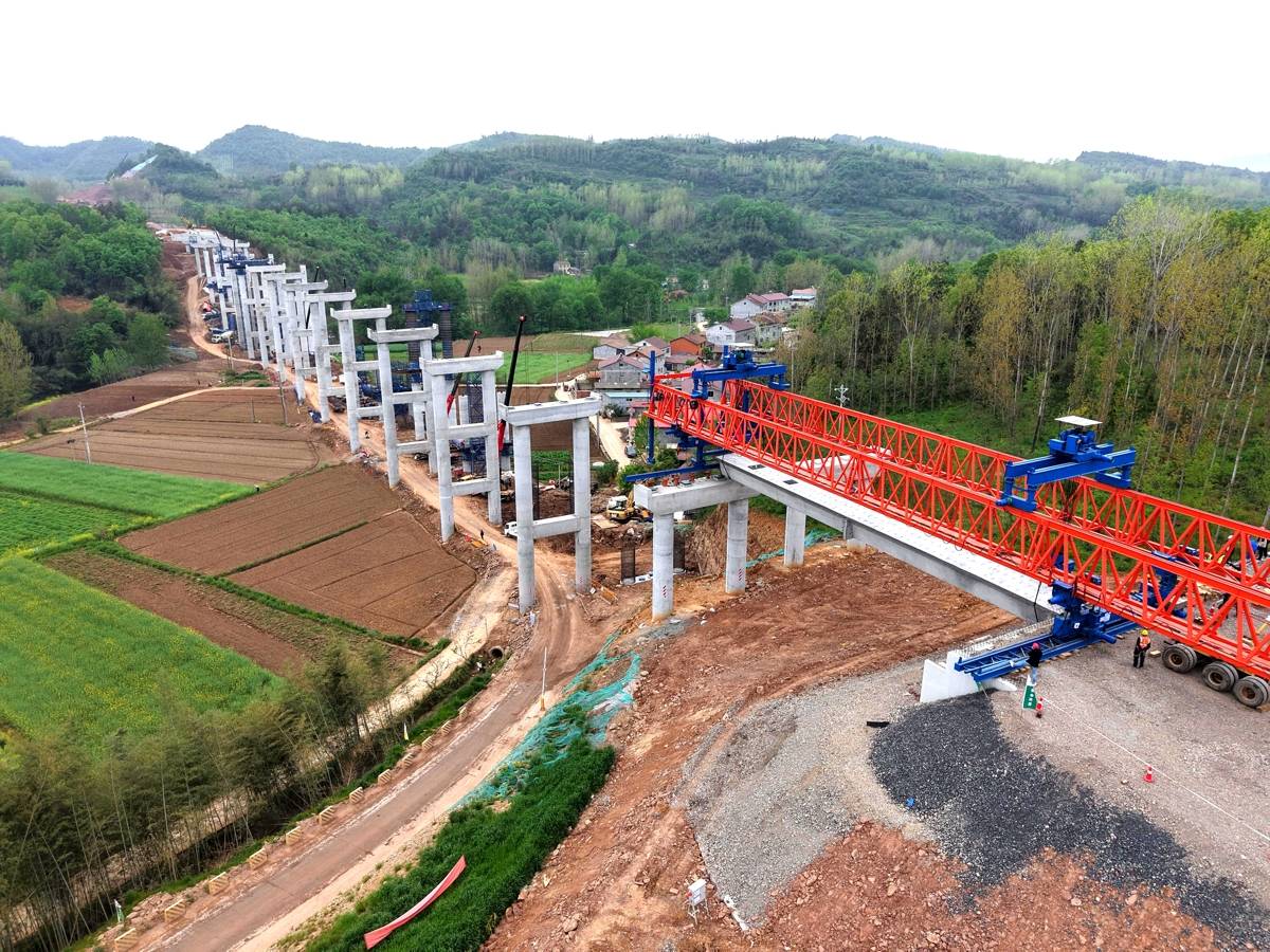 4月7日,平宜高速襄阳段八都河大桥建设现场,首片箱梁架设成功。湖北日报全媒记者记者祝兆林、通讯员朱鹤飞摄