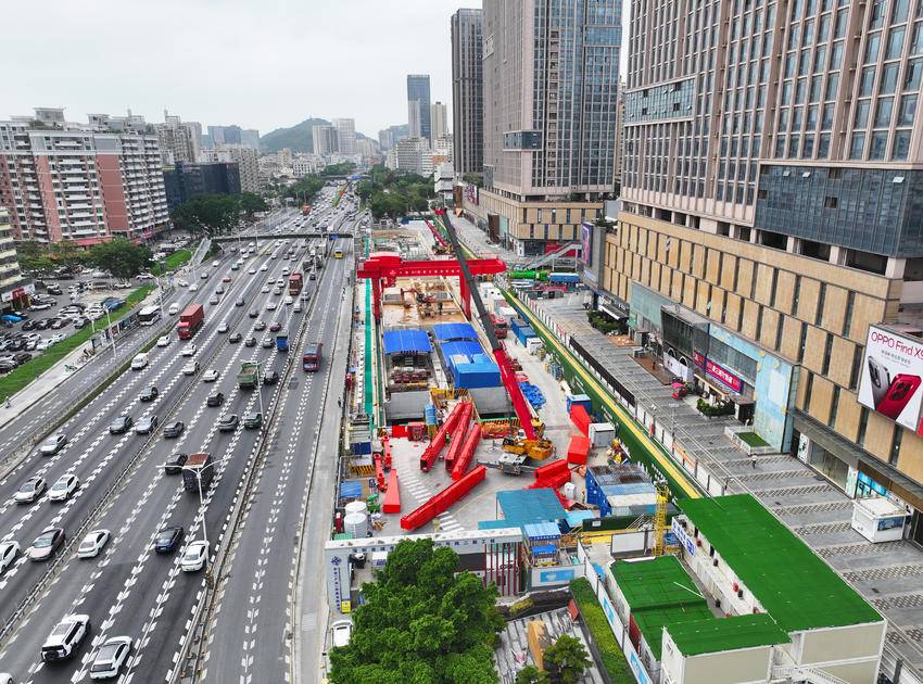 文汇站位于宝安区107国道与上川一路交叉路口,沿107国道南北向敷设,为地下两层明挖岛式车站,车站总长248.5米,标准段外包宽度20.1米,底板最大埋深约16.2米。车站周边环境复杂,东侧紧邻万达广场,西侧为107国道,且站址范围内管线密集、地质条件多变,施工难度大、风险高。