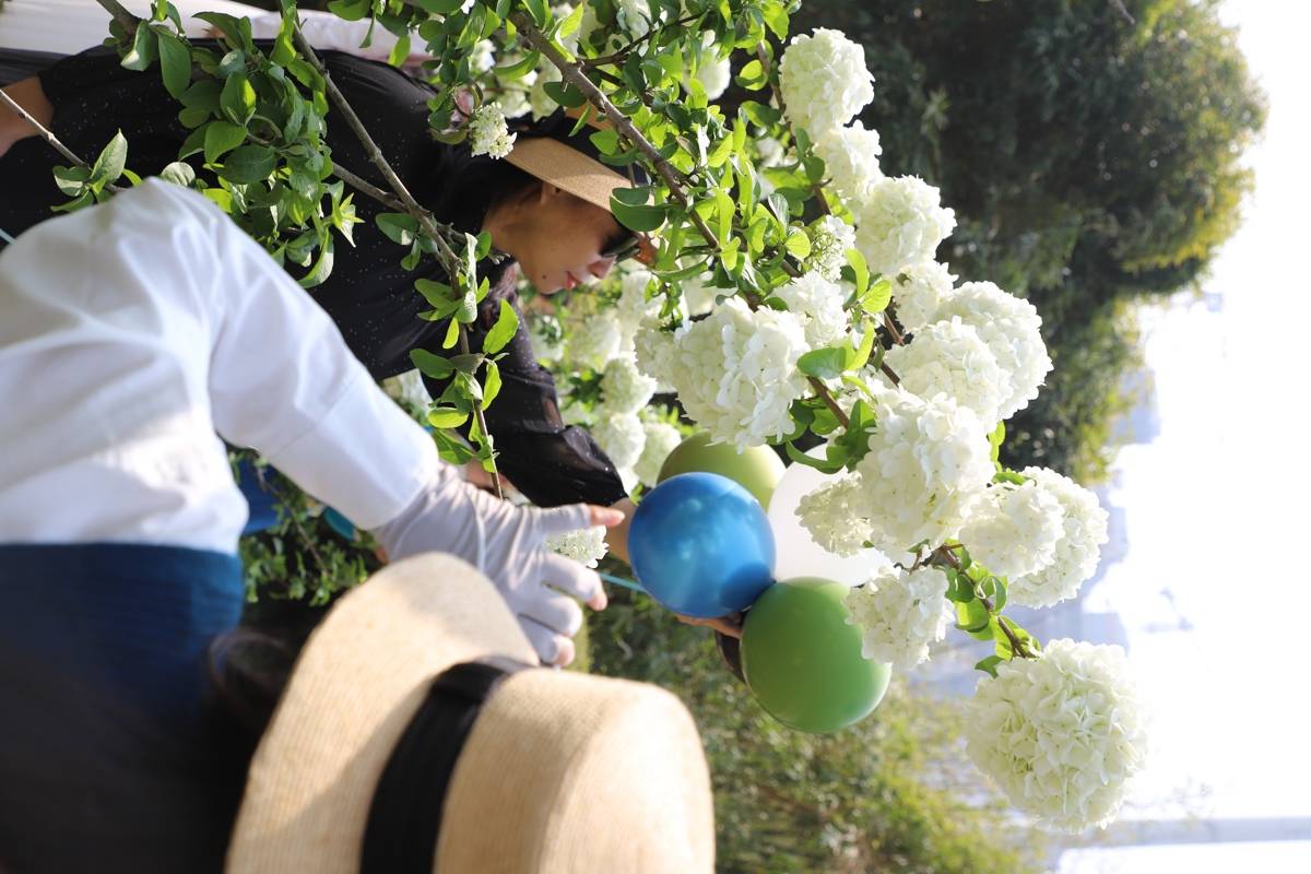 游客打卡沙湖公园木绣球花,拍摄创意照片