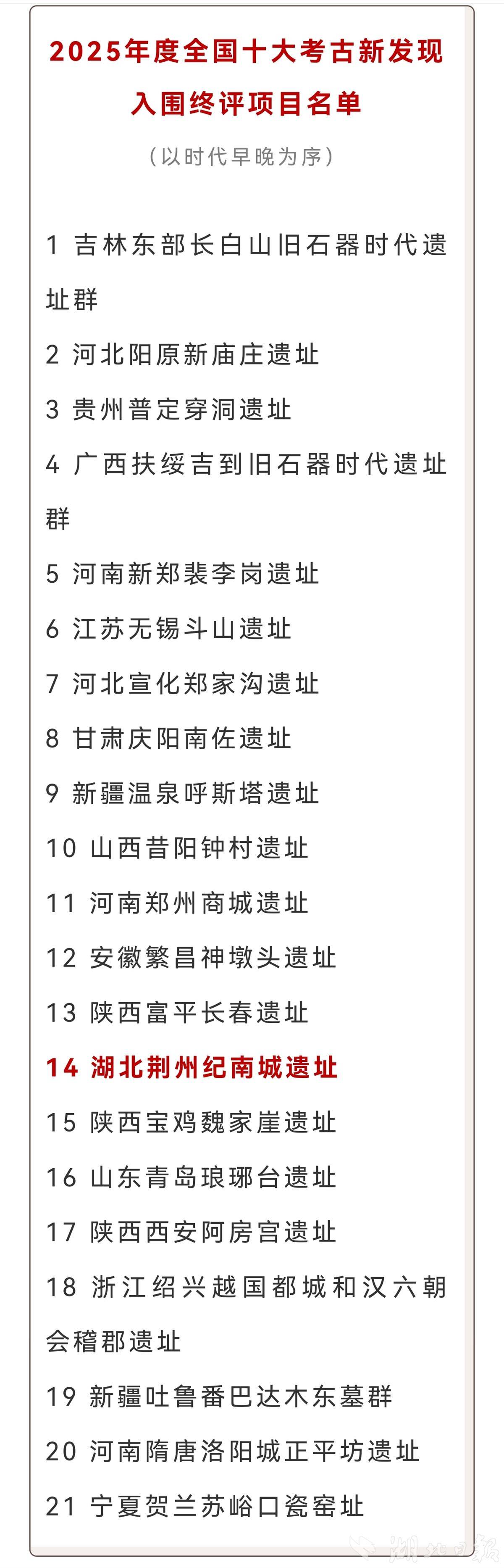 湖北日报讯(记者海冰)4月7日,2025年度全国十大考古新发现初评结果揭晓。根据投票结果,包括湖北荆州纪南城遗址在内的21个项目入围终评。