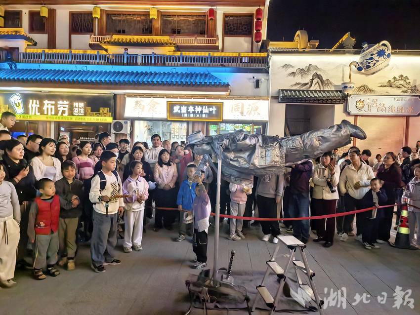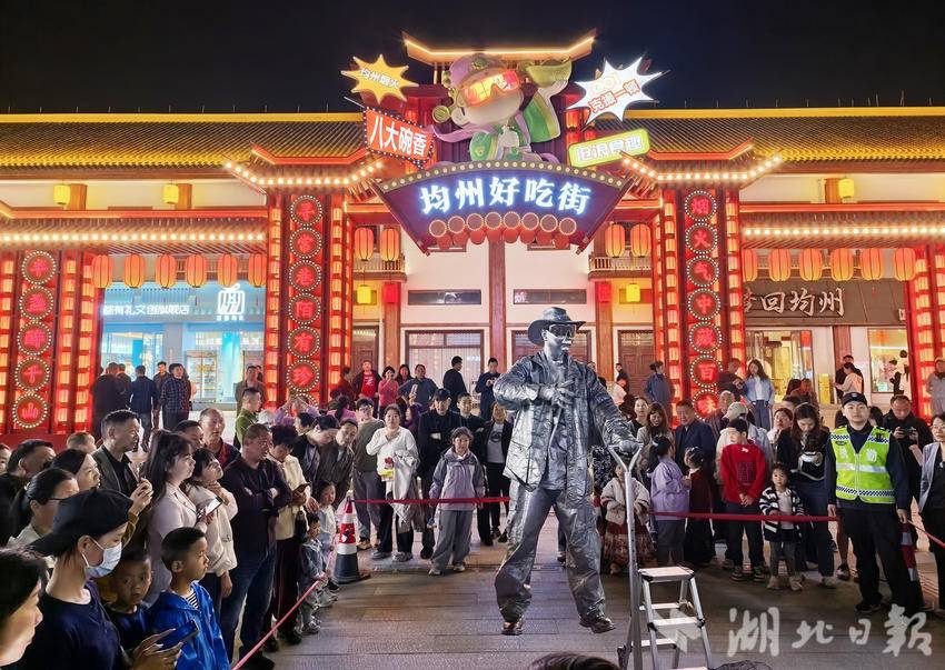 湖北日报讯(通讯员许光泽、袁树林)2026年清明小长假,丹江口均州老街游人如织、热闹非凡。街区推出天女散花、悬浮银人、古风NPC互动等特色街头演艺,搭配丰富美食小吃,为游客带来沉浸式游玩体验。
