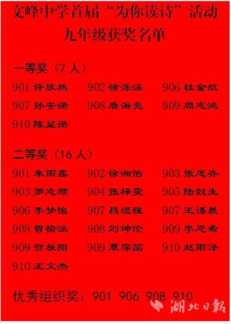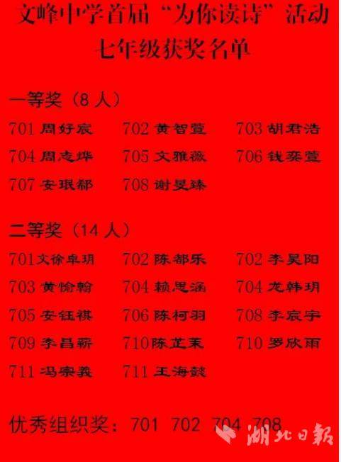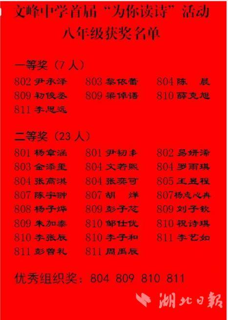 湖北日报讯(通讯员王光兴、刘霞、刘慧、高翔、聂峰林)近日,湖北省荆门市文峰中学首届“为你读诗”活动历经精彩角逐,圆满落下帷幕。此次活动面向全体学生开展,学子们踊跃参与,以诗为纽带,在文字与声音的碰撞中,尽情展现新时代少年的青春风采,也为全校学生搭建起表达自我、感受文字魅力的平台。