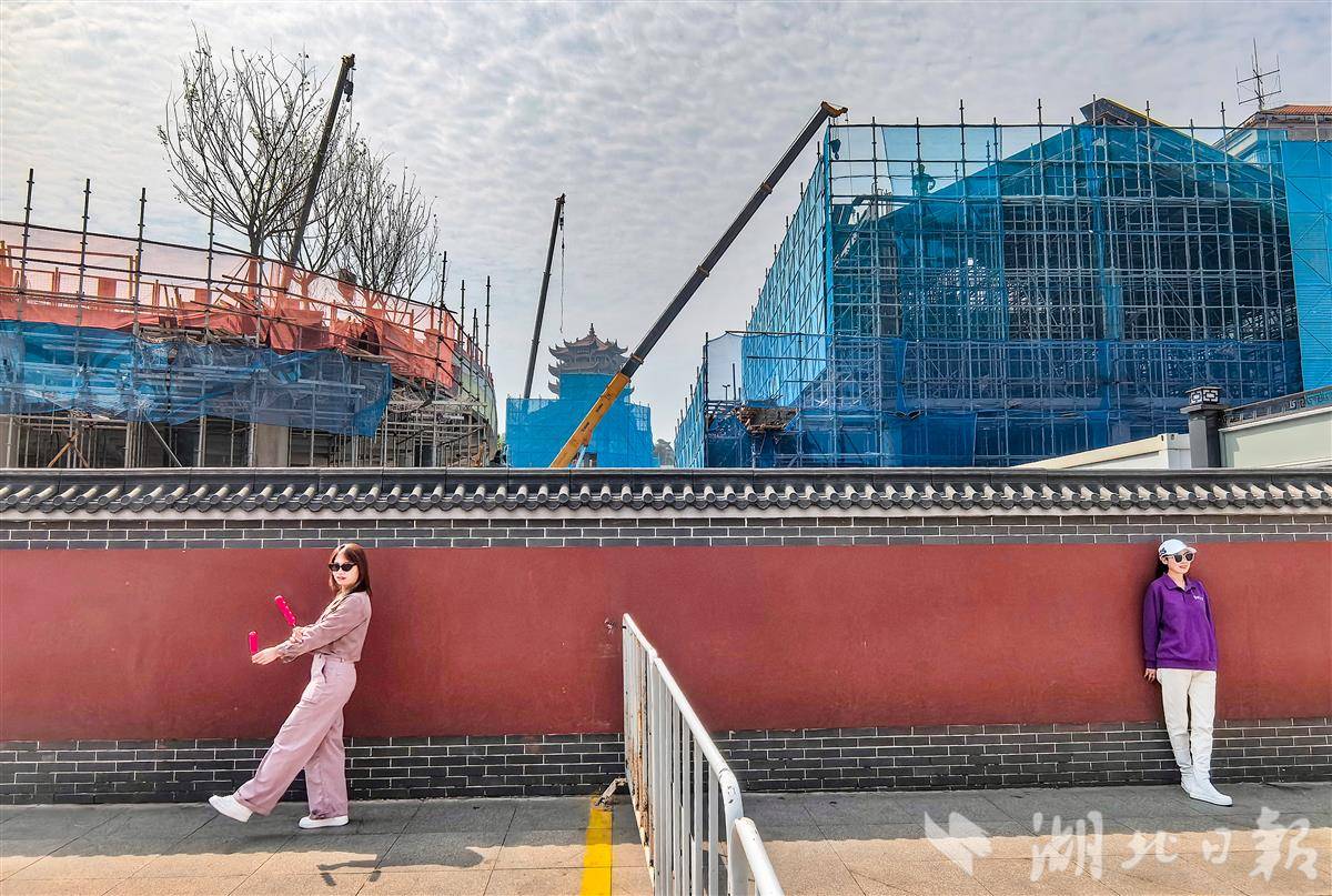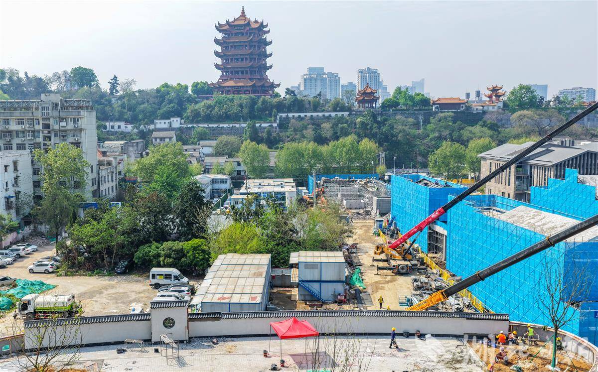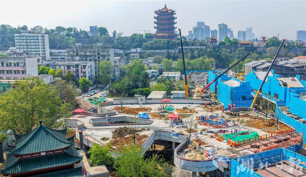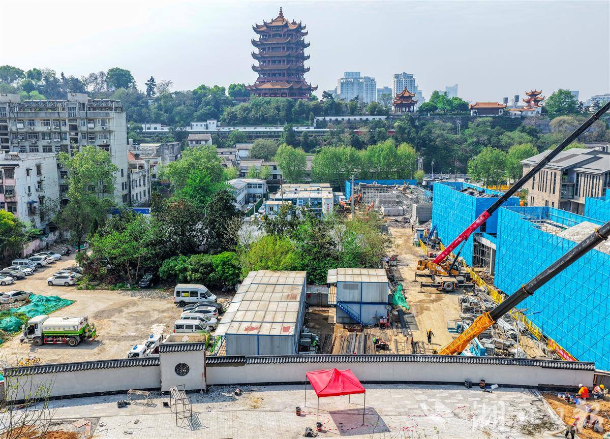 4月7日,鸟瞰武汉司门口黄鹤楼站红墙升级工程,现场施工一派繁忙,目前,“新红墙”雏形初现。与黄鹤楼同框将再添新机位,令广大市民游客充满期待。