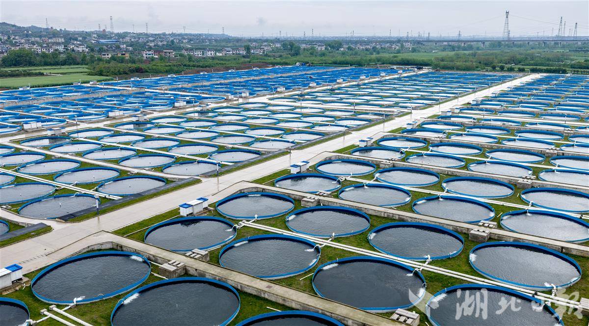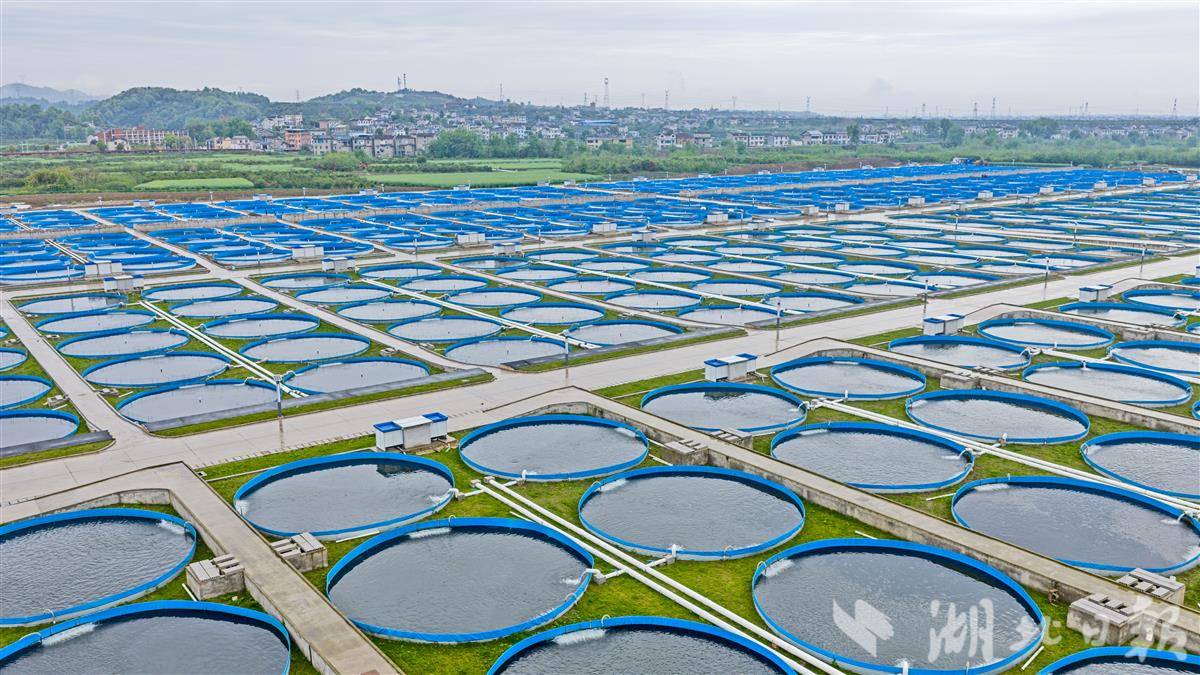 4月7日,宜都清江鲟鱼谷二期露天圆形鱼池内,成群鲟鱼在阳光下自在游动,项目建设与投产工作稳步推进。