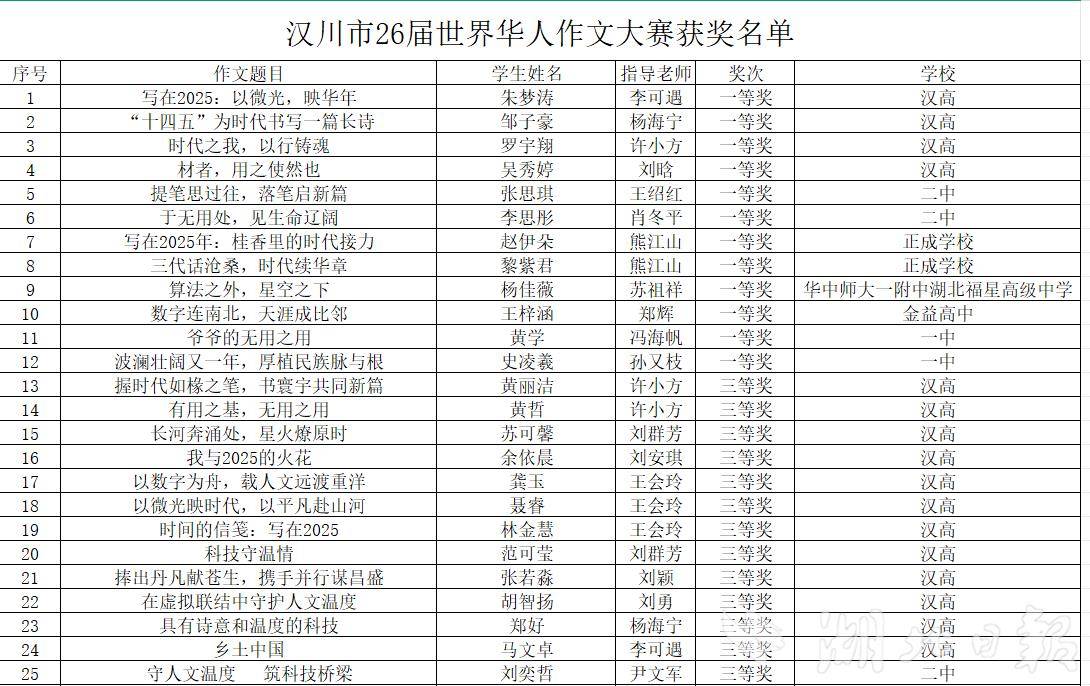 “作为新时代的文化桥梁,世界华人学生作文大赛不仅是一场作文竞赛,更是赓续民族文脉的重要载体,汇聚海内外中华儿女共创辉煌的强大力量。”汉川市教育局相关负责人表示,该局精心组织、积极动员学生参与,并组建专业指导教师团队,鼓励学子们结合时代感悟与个人体验,书写真情实感、抒发家国情怀。