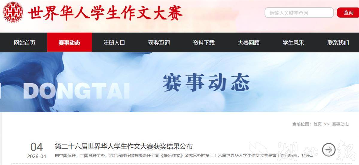 第二十六届世界华人学生作文大赛获奖结果公布。