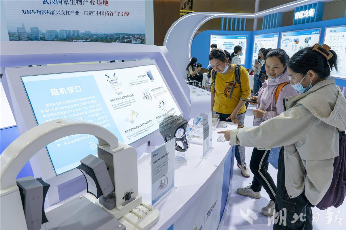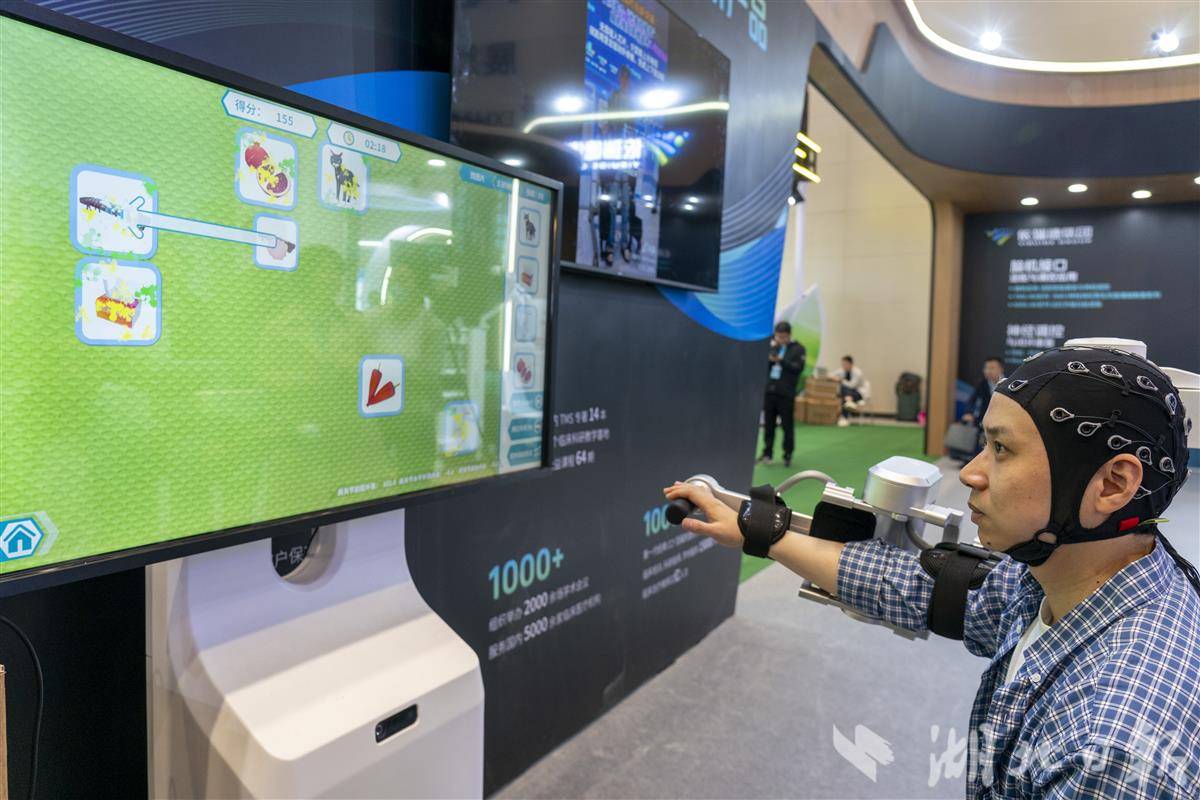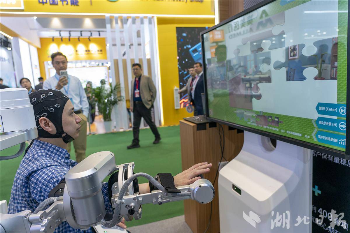 光谷企业依瑞德集团展区,工作人员在演示脑机应用控制的上肢康复机器人做康复训练。