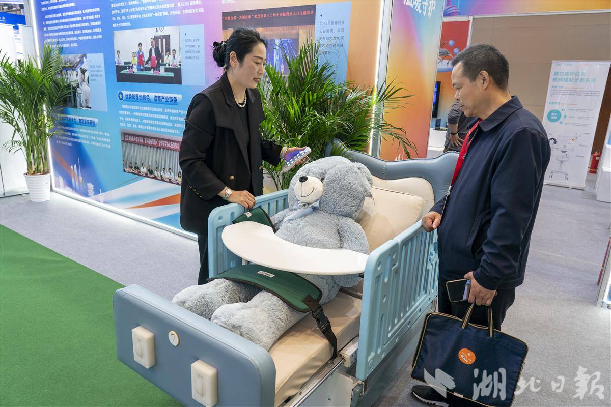 科技助残健康产品展示专区,观众参观智能儿童护理床。