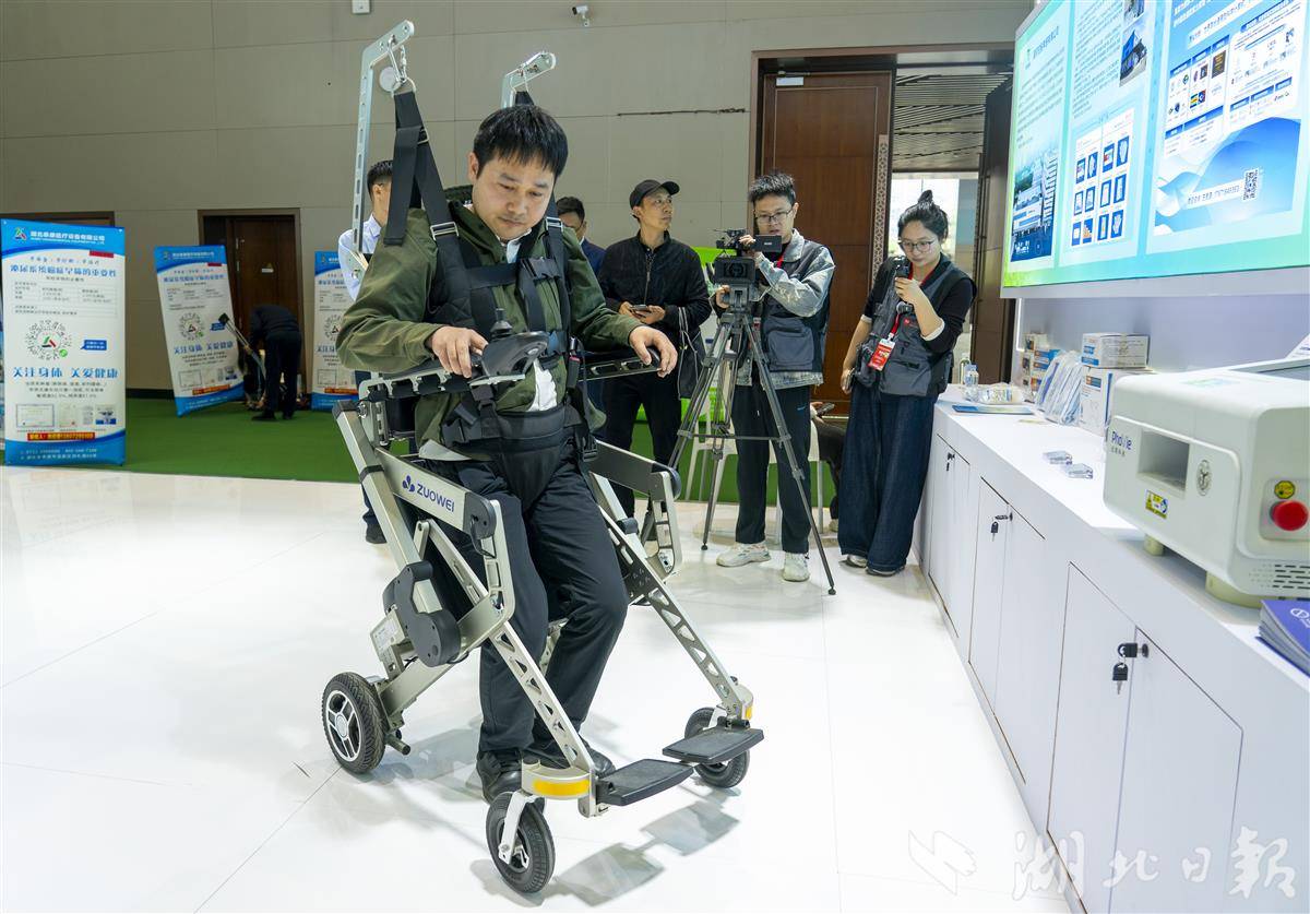 孝感市展区,工作人员演示电动辅助站立轮椅。