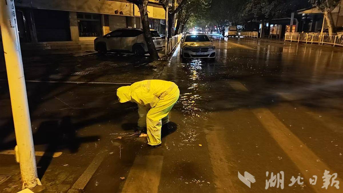 江岸区台北路农村商业银行门口,排渍人员清理雨水篦子树叶助排积水。
