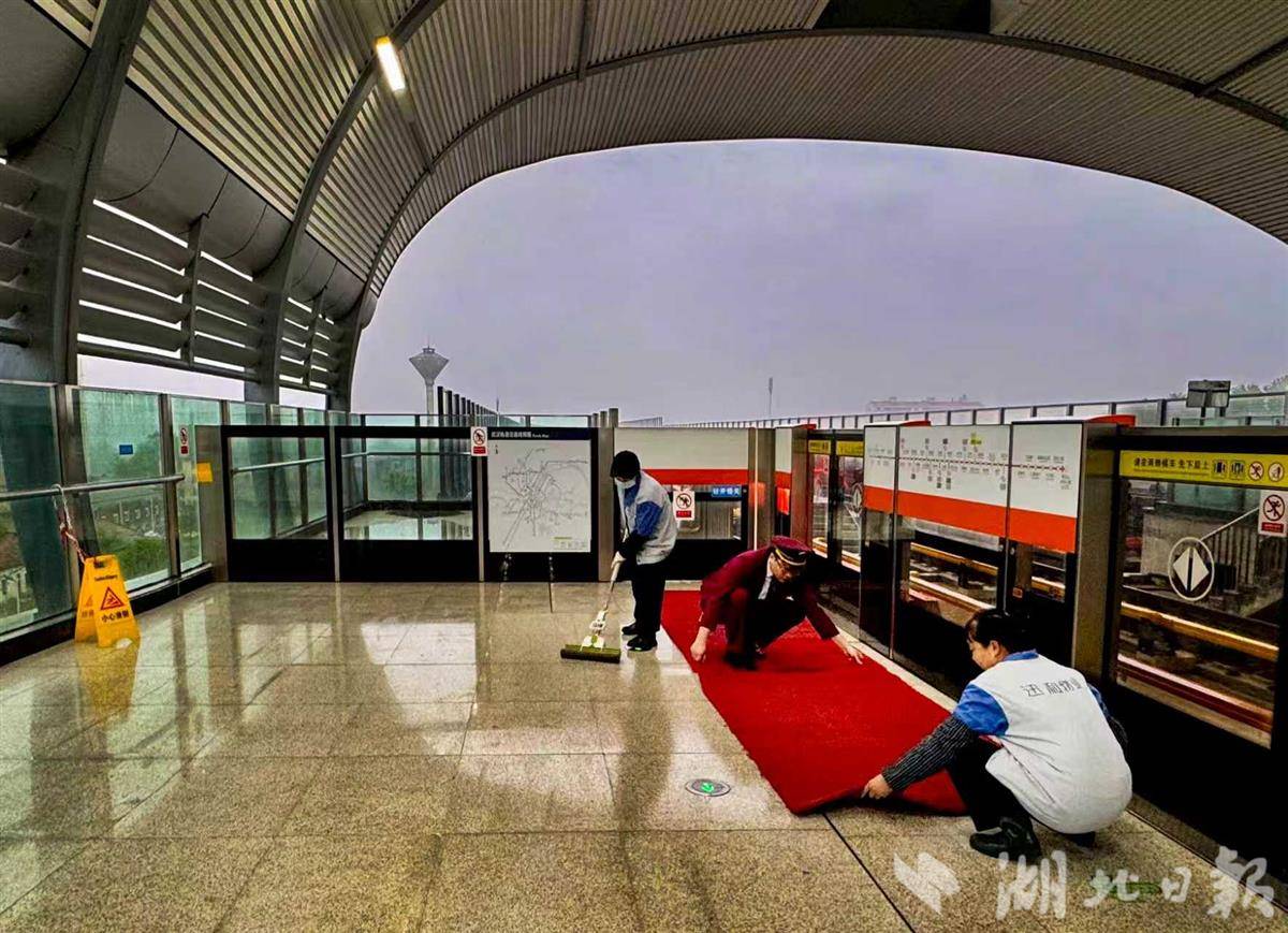 早上开班前,7号线横店站工作人员正在铺设防滑地垫。(湖北日报通讯员朱园萃 摄)