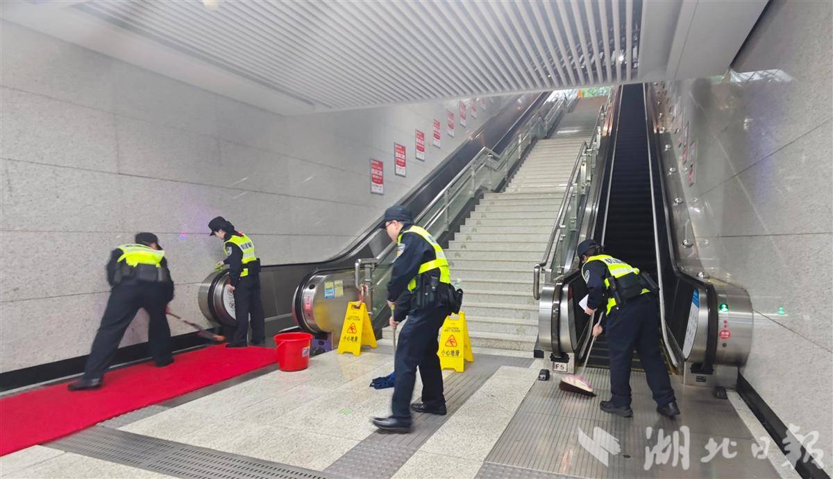除路面交通保障外,针对轨道交通出行安全,轨道交通管理分局同步启动应急预案,全力守护乘客出行平安。分局在全网重点车站叠加投入警力,加强巡查巡检,组织民辅警、站务员、护卫等力量,对高架站顶棚、换乘通道、地铁出入口、陡峭扶梯等重点部位开展全面安全检查,及时发现并处置各类风险隐患,确保轨道交通运行安全;同时在楼梯、进出站通道等易滑部位布置工作人员,摆放各类防护设施,反复提醒过路乘客注意防滑、防摔,全方位筑牢轨道交通安全防线。