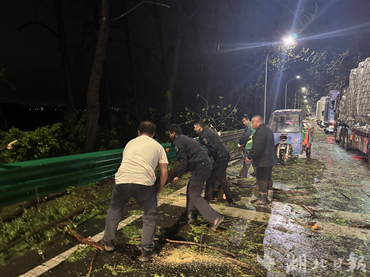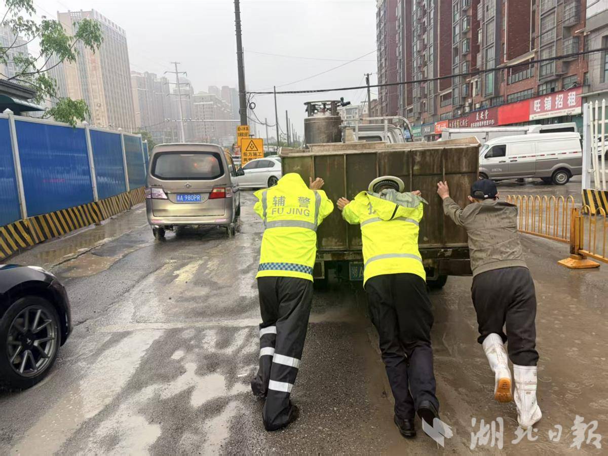 暴雨大风导致多路段出现车辆避让、事故缓行、障碍物阻行等情况。武汉交警快速反应、高效处置,全力清理障碍、疏导车流,缓解通行压力。在黄陂区汉口北大道路口,一辆小型货车因故障突然抛锚停在路中间,后方车辆纷纷避让,路口通行几近瘫痪。正在执勤的黄陂交警五中队辅警郭奔、周陈、卢浩发现后立即上前了解情况。确认车辆无法重新启动后,三人立即合力将车推行至路边安全区域,路口很快恢复通行;蔡甸区百曲公路出现多棵树木倒伏横拦路面,辅警王方正、龙江涛等人立即联络路政部门协同清理,仅用10分钟便清除所有障碍物,让路段顺利恢复畅通;江汉区常青一路与双华路路口9时许,一棵大树被风雨折断倒在路中,影响车辆正常通行,民警胡维雄快速下车清理搬运折断的树木,及时消除安全隐患,保障道路通行顺畅。