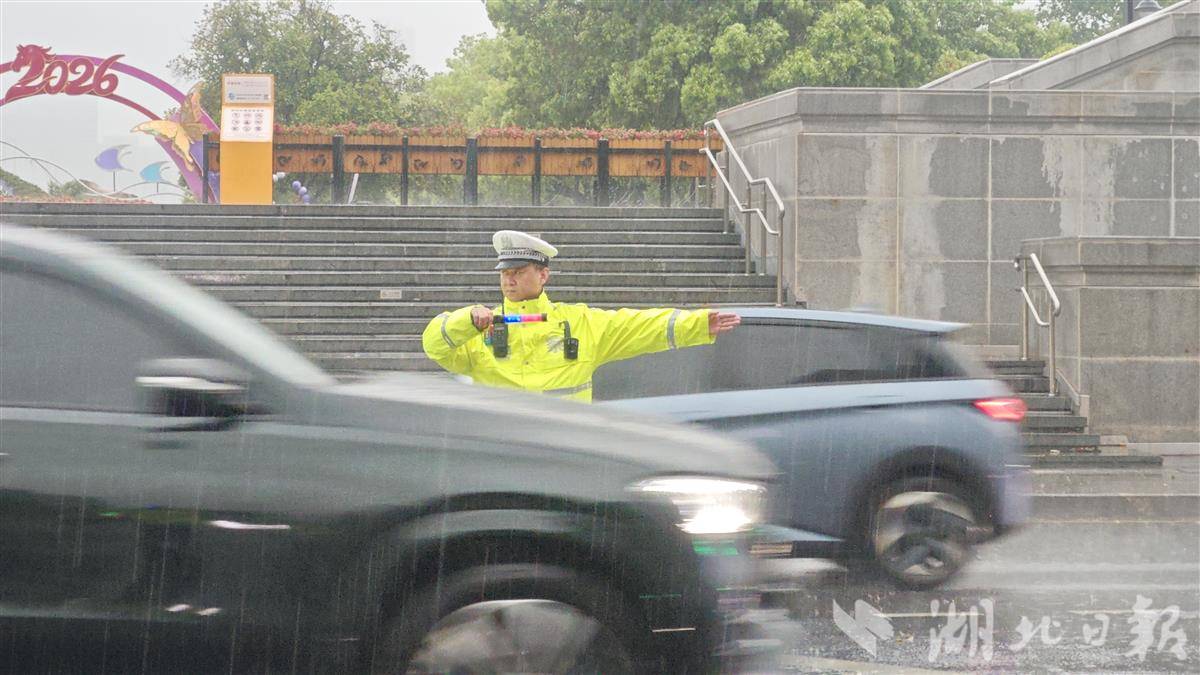 9日清晨,早高峰与暴雨叠加,各类险情集中出现,执勤民辅警坚守一线全力护航。青山区建设六路与红钢一街路口栏杆倾倒、信号灯失灵,该区域紧邻中小学,人流车流密集,执勤民警快速联动相关部门开展抢修,同时加强现场指挥疏导,引导学生与家长安全有序通行;在江岸区解放公园路,暴雨如注,交警冒雨站在路口中央,以标准手势指挥车流;长江新区武湖街道清晨暴雨持续,交警谭智豪全程冒雨值守,一边疏导交通,一边扶正被撞护栏,全力保障辖区道路通行顺畅。