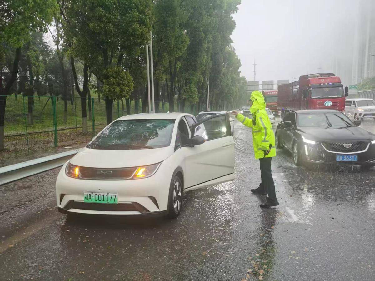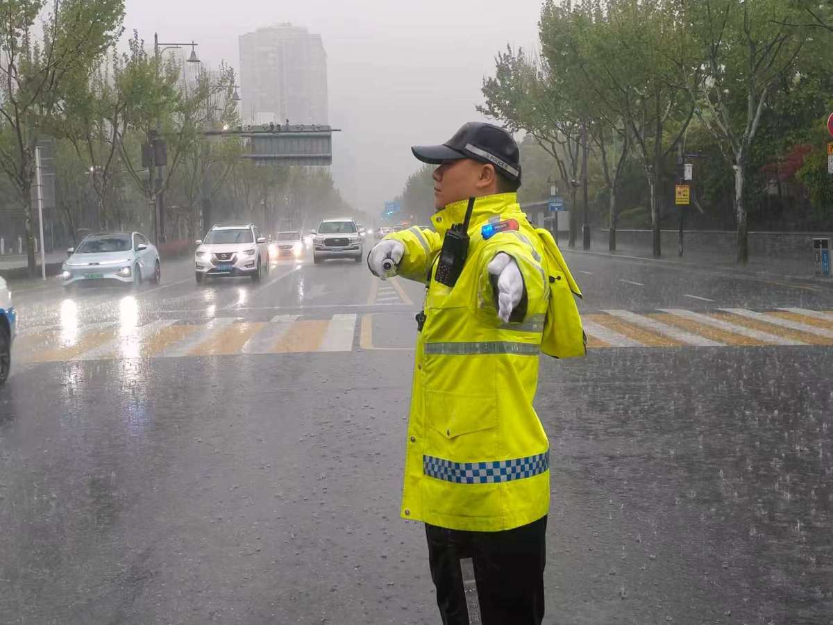 10时许,江汉大队民警许翔正在三环线巡逻时发现两车发生事故。顶着倾盆大雨,许翔指挥驾驶员将事故车辆撤离到路边,并快速处置该事故,保障了三环线的正常通行秩序。与此同时,武昌交警仍在包括友谊大道等辖区重点路口坚守岗位。