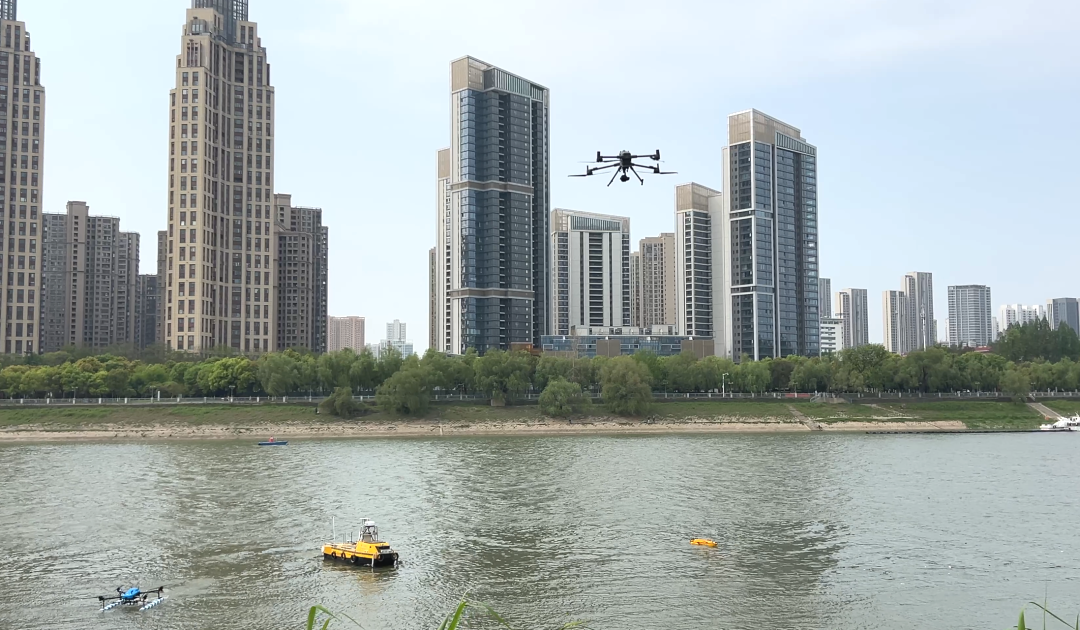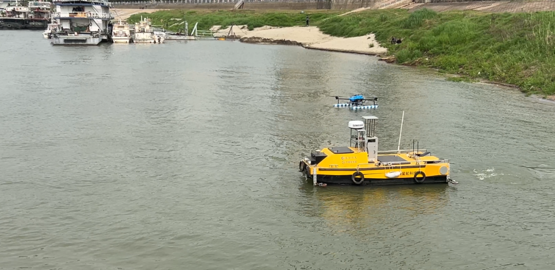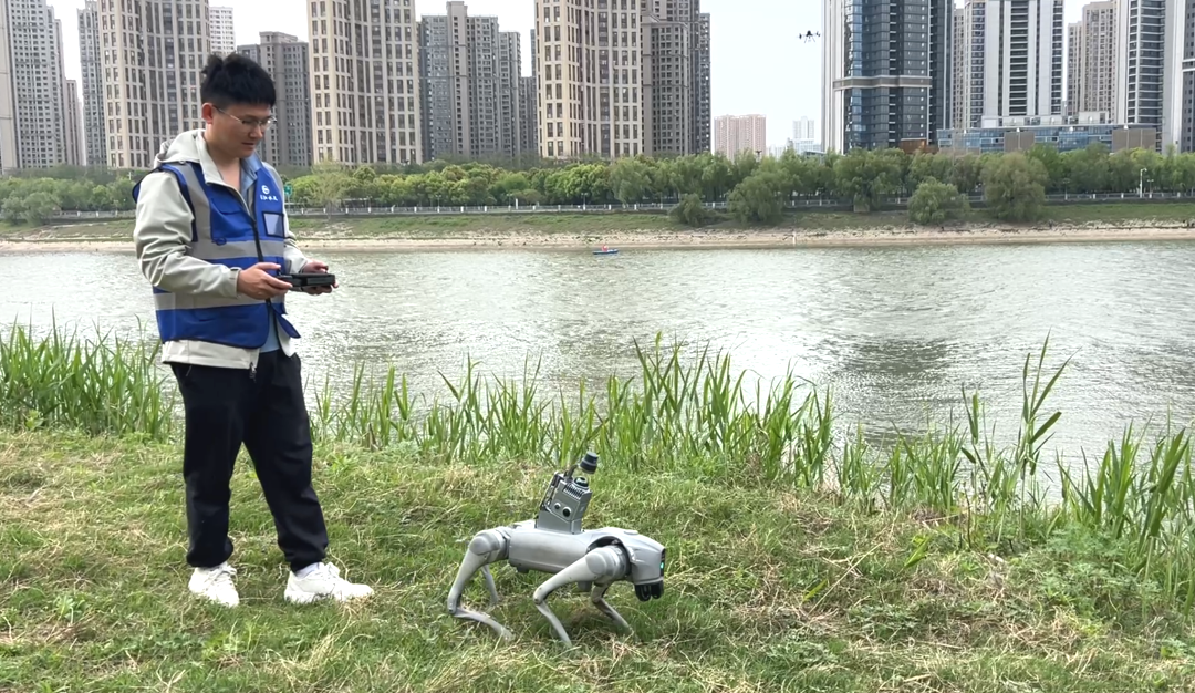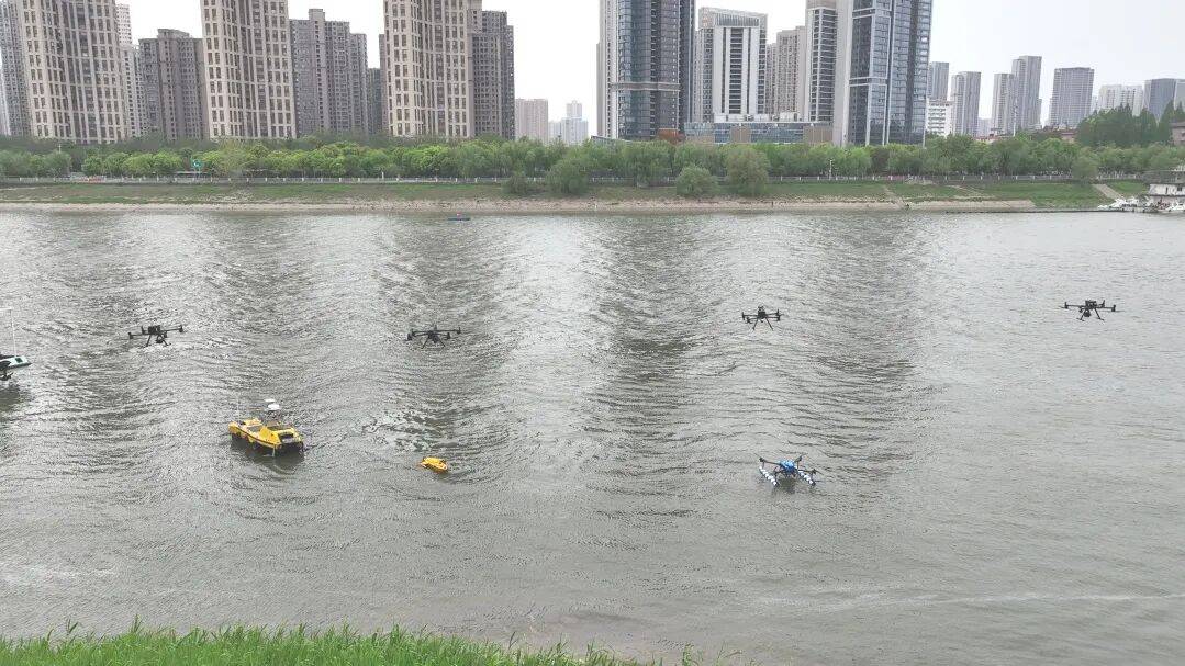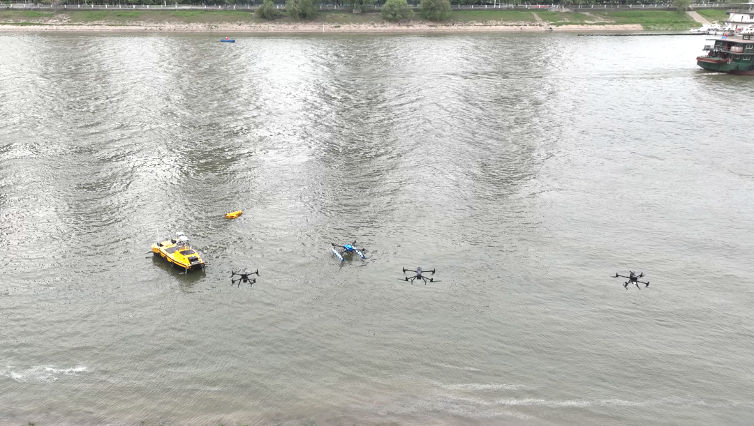 采用无人船多波束测深系统、无人机机载激光雷达、测量机器狗协同测量,实施构建水陆一体实景三维模型。(受访单位供图)