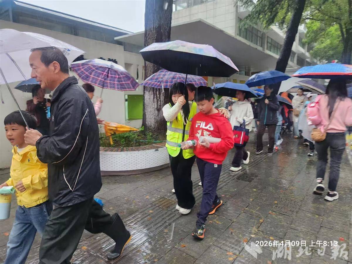 4月9日,一场突如其来的暴雨席卷江城武汉。清晨的上学路湿滑难行,武昌区中小学、幼儿园里却有一道道暖流在悄然涌动——教职工、保安师傅、家长志愿者用细致入微的守护,为孩子们撑起了一把把遮风挡雨的“彩虹伞”。