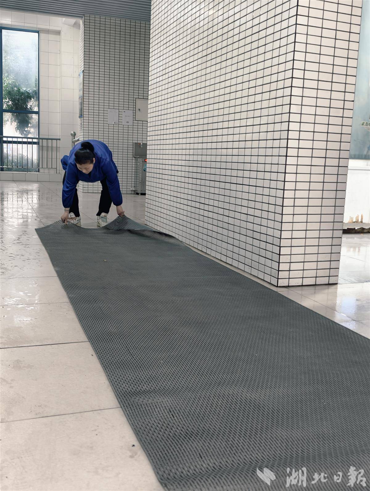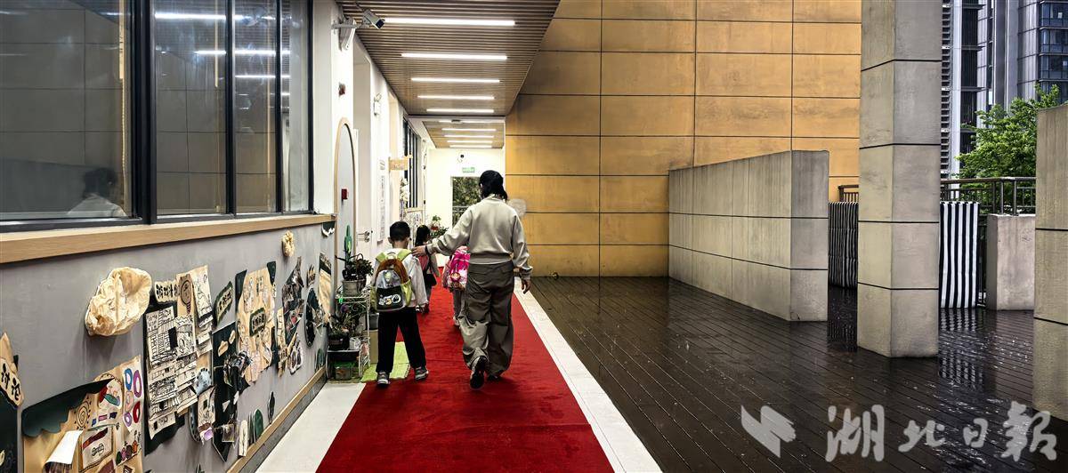 早上7时许,在武昌滨江实验幼儿园,一条鲜红的地毯格外引人注目。趁着雨势稍歇,保安师傅们迅速行动,将红毯从楼梯口一路铺设至每个班级门口。这条红地毯不仅隔绝了湿滑的地面,更如一条温暖的纽带,连接着家与园,温暖了每一位家长和孩子的心。