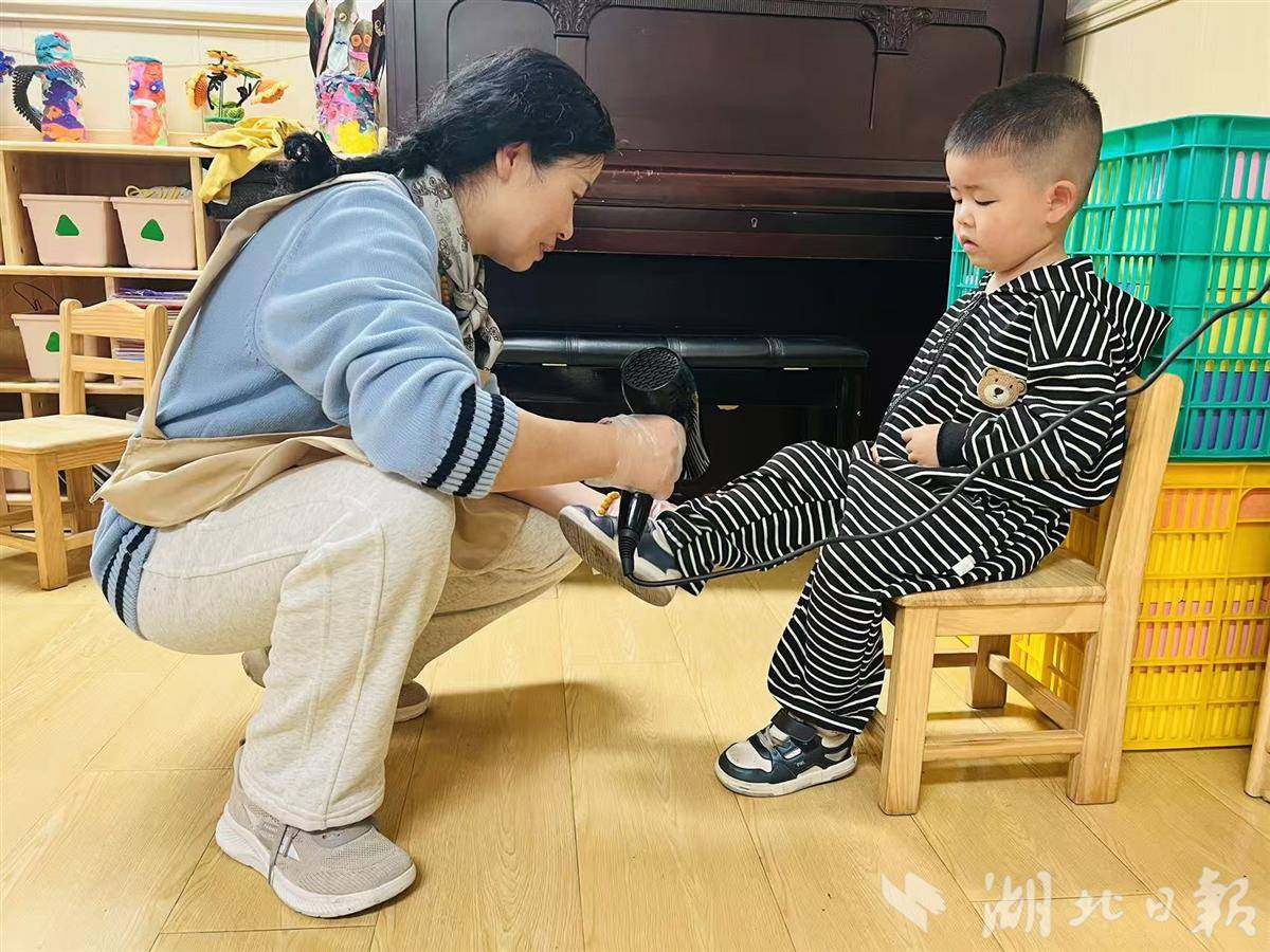 在沙湖幼儿园,面对孩子们淋湿的衣角和鞋袜,老师们拿出了吹风机,蹲下身子,仔细吹干每一处潮湿。“孩子不能着凉”,这句朴素的话语背后,是老师们对童心最细腻的呵护。