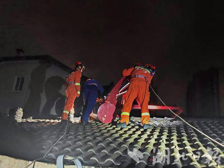 4月9日零时59分,长江新区阳逻街某小区内发生险情,一栋居民楼楼顶的太阳能热水器被大风刮落,悬在半空中,随时有坠落的风险。武汉市消防救援指挥中心接到报警后,立即调派武湖消防救援站出动1辆消防车、7名消防员赶赴现场处置。到达现场后,两名消防员首先利用安全绳搭建固定锚点,在做好自身安全防护后,逐步靠近悬吊的太阳能热水器,使用安全绳对其进行拖拽、固定与牵引。经过近20分钟紧张处置,悬吊的热水器被成功转移至安全区域,险情得以排除。