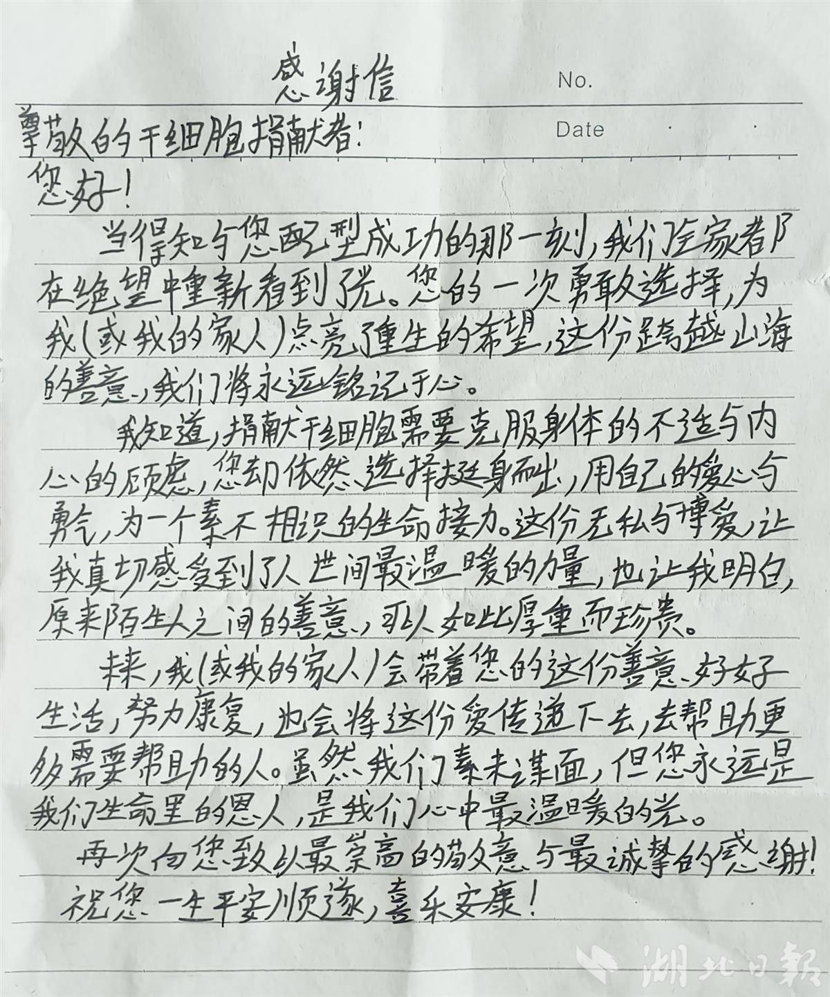 2024年8月,他在一次献血时主动留下血样,加入中华骨髓库。没有什么豪言壮语,他只是想着:“趁年轻身体好,能帮一把就帮一把。”命运的回应来得很快。今年1月,小李接到当地红十字会通知,他与一名血液病患者高分辨配型成功。面对仅有几万分之一的配型概率,他没有丝毫犹豫,当即答应捐献。此后,他全力配合完成高分辨检测、体检。为了以最佳状态完成这场生命接力,他主动调整作息,坚持每日散步、规律锻炼、滴酒不沾,全心筹备。捐献当天,他躺在采集床上整整四小时,腰背因注射动员剂有些酸胀,但他始终带着笑容。患者家属的感谢信辗转送到他手中。信里写道:“当得知与您配型成功的那一刻,我们全家从绝望中重新看到了光。您永远是我们生命里的恩人,是我们心中最温暖的阳光。”