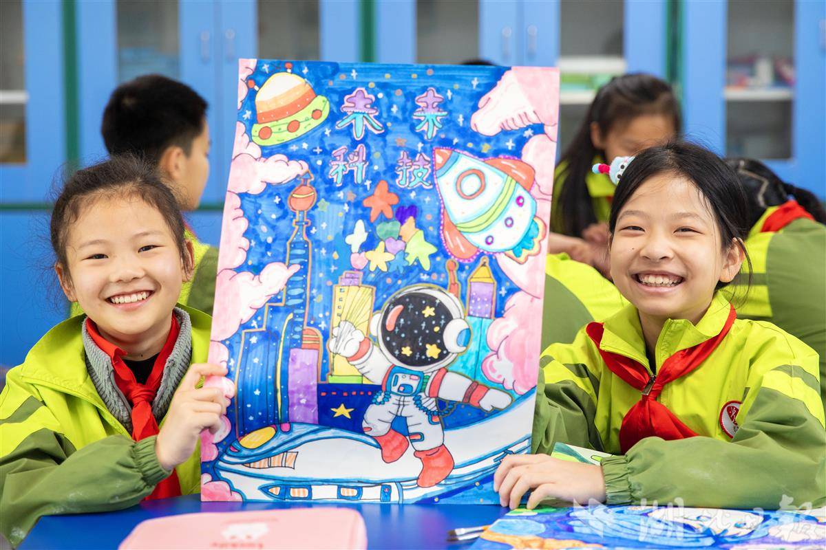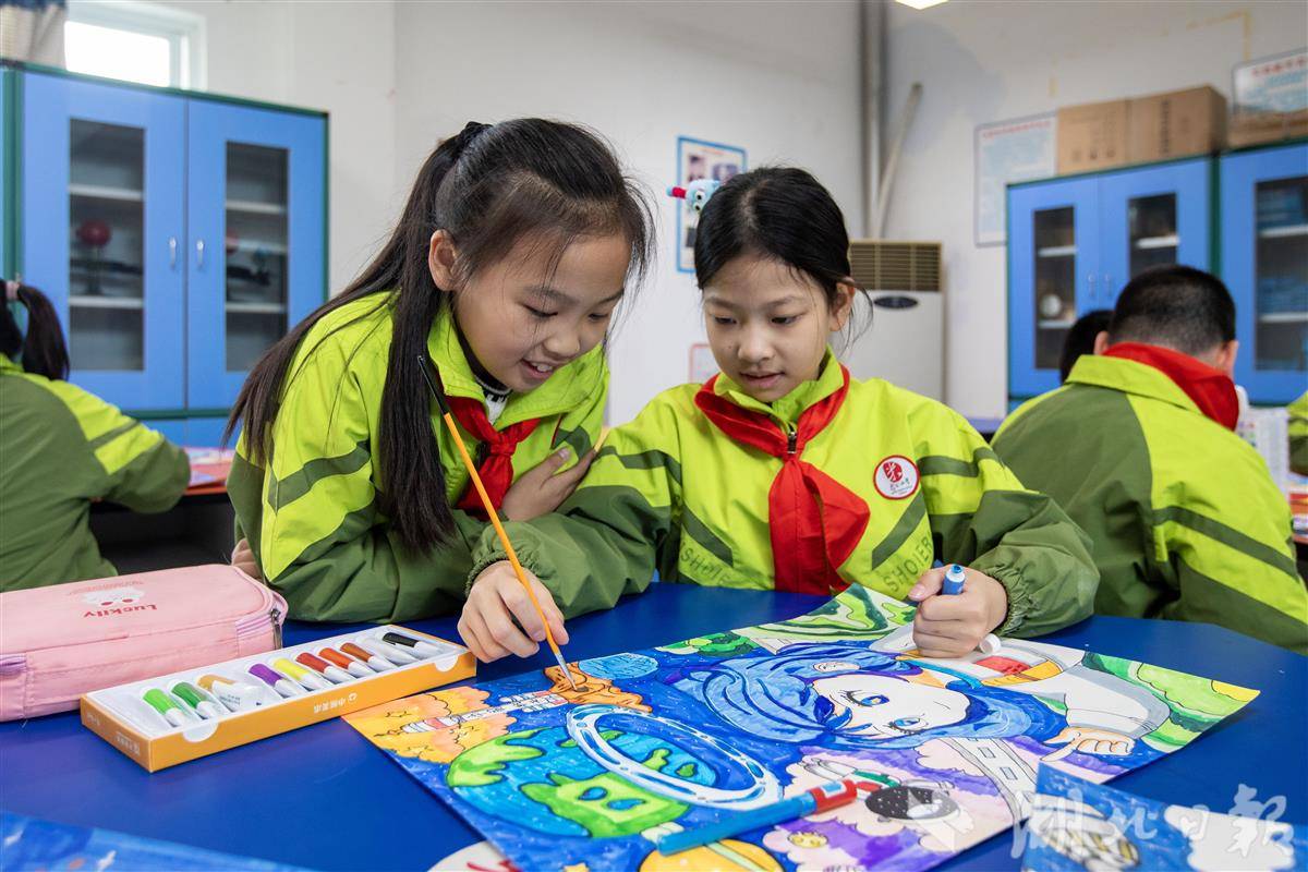 4月9日,在襄阳市米公小学,同学们正在认真绘制航天主题绘画。