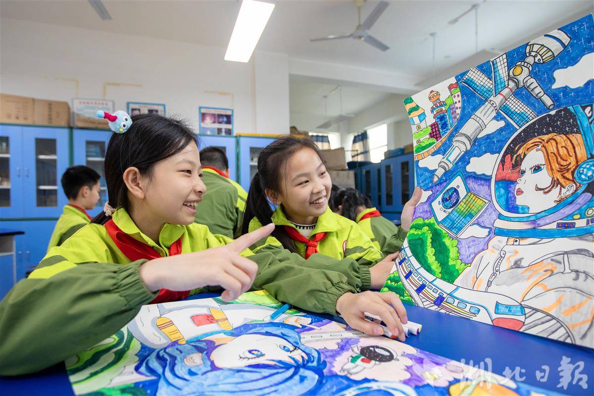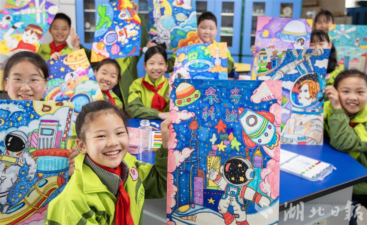 4月9日,在襄阳市米公小学,同学们正在展示自己绘制的航天主题绘画。