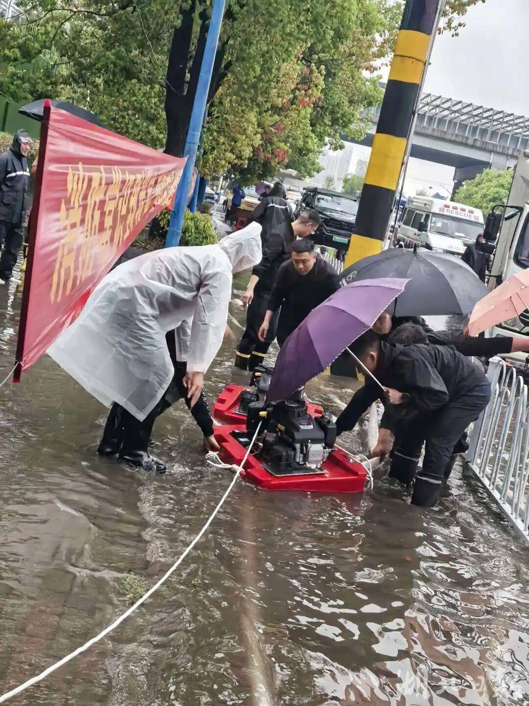 “嗡——嗡——”随着一台台浮艇泵成功启动,沉闷而有力的轰鸣声响彻雨中,打破了市场的慌乱。这些适配浅水区排水、可灵活漂浮的专业设备,如同一个个不知疲倦的“治水卫士”,稳稳浮在水面上,凭借负压作用大口“吞噬”着浑浊积水,经过滤网拦截杂质后,再通过出水口强力外排;一旁的抽水机组也马力全开,将积水源源不断地抽往远处排水通道,形成一道高效排涝的“流水线”。队员们脚踏积水,浑身湿透却毫不在意,目光紧紧盯着水位变化和设备运行情况,及时调整作业位置、排查设备隐患,确保抽排作业不间断。