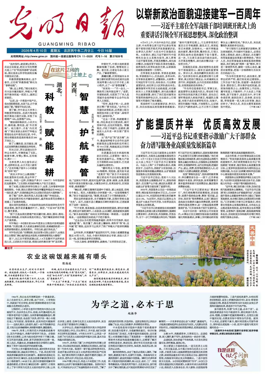 4月10日,《光明日报》头版刊发文章《湖北:“科教”赋能春耕》,聚焦科教资源富集的湖北,看这片辽阔的土地上,“科教势能”如何转化为“春耕动能”,将科教优势“种”进田野。