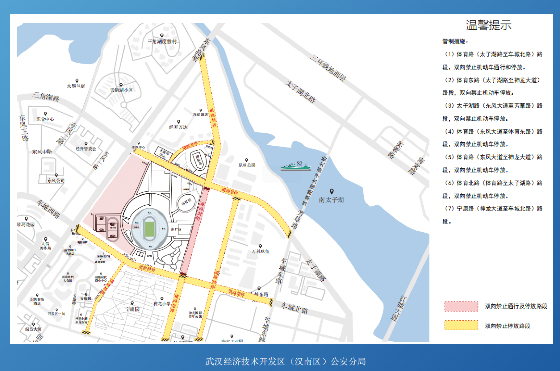 1.当日体育中心周边观众较多,车流量增大。前往该区域人员请尽量错峰出行,高峰时段提前规划路线,尽量避开体育路(东风大道至神龙大道)、太子湖路(东风大道至芳草路)、体育东路、车城北路(东风大道至车城东路)、宁康路等路段。需通行该区域的人员及车辆,可选择绕行神龙大道、沌阳大道、太子湖北路、江城大道等外围道路。