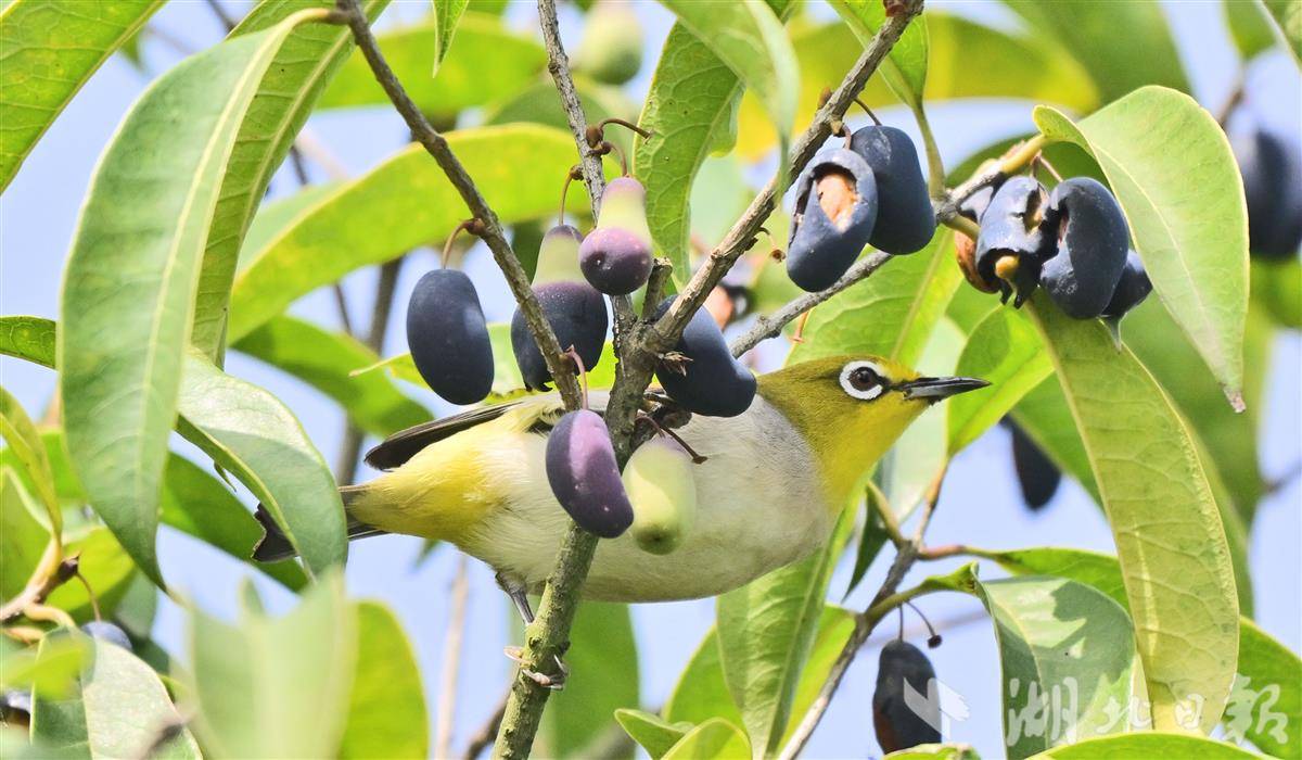 4月10日,宜昌金银岗三峡植物园内,成群暗绿绣眼鸟活跃于林间枝头,这些体长仅10厘米左右的 “林间精灵”,在挂满紫黑色浆果的树枝间穿梭倒挂、啄食翻飞,为春日植物园增添勃勃生机。