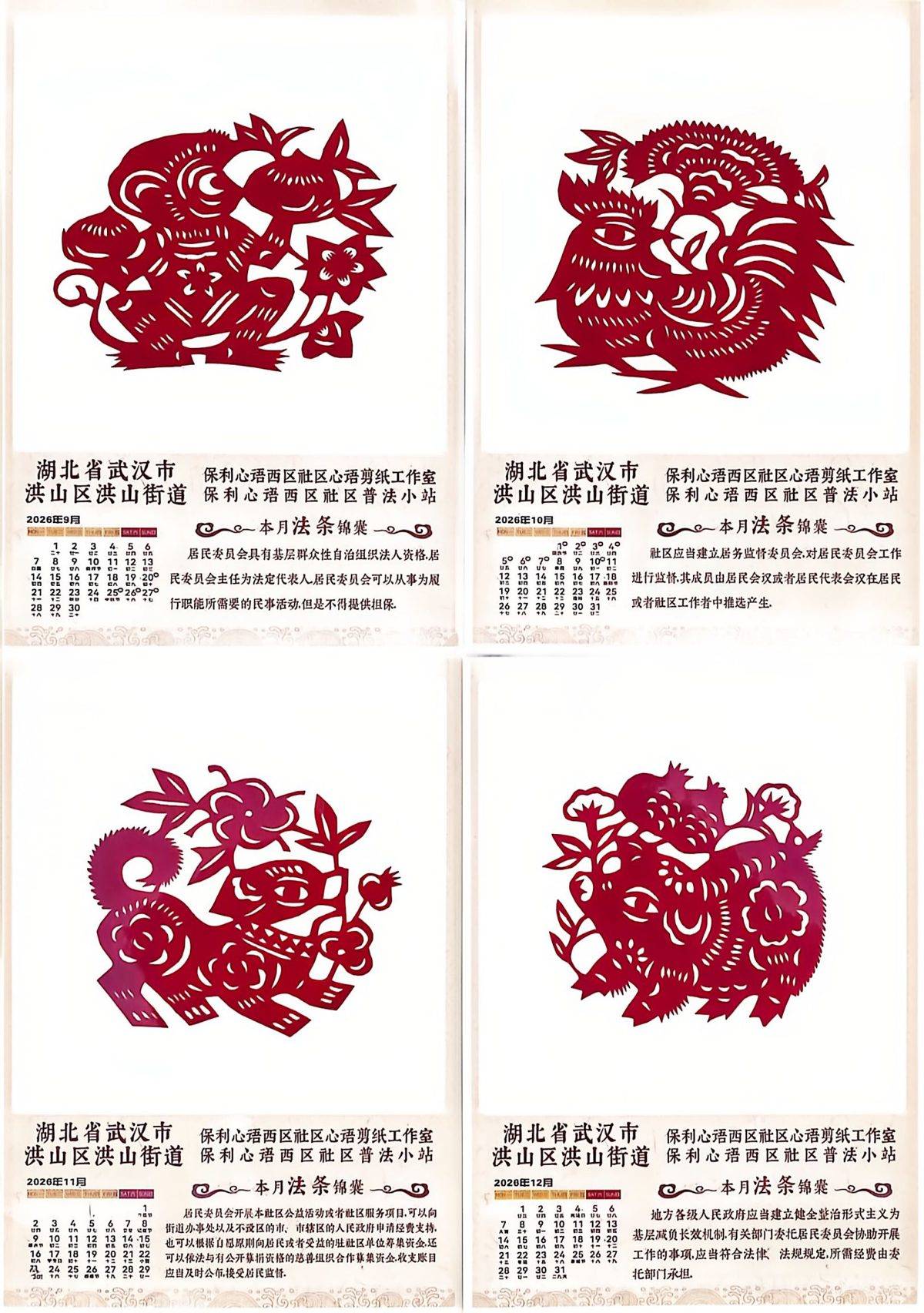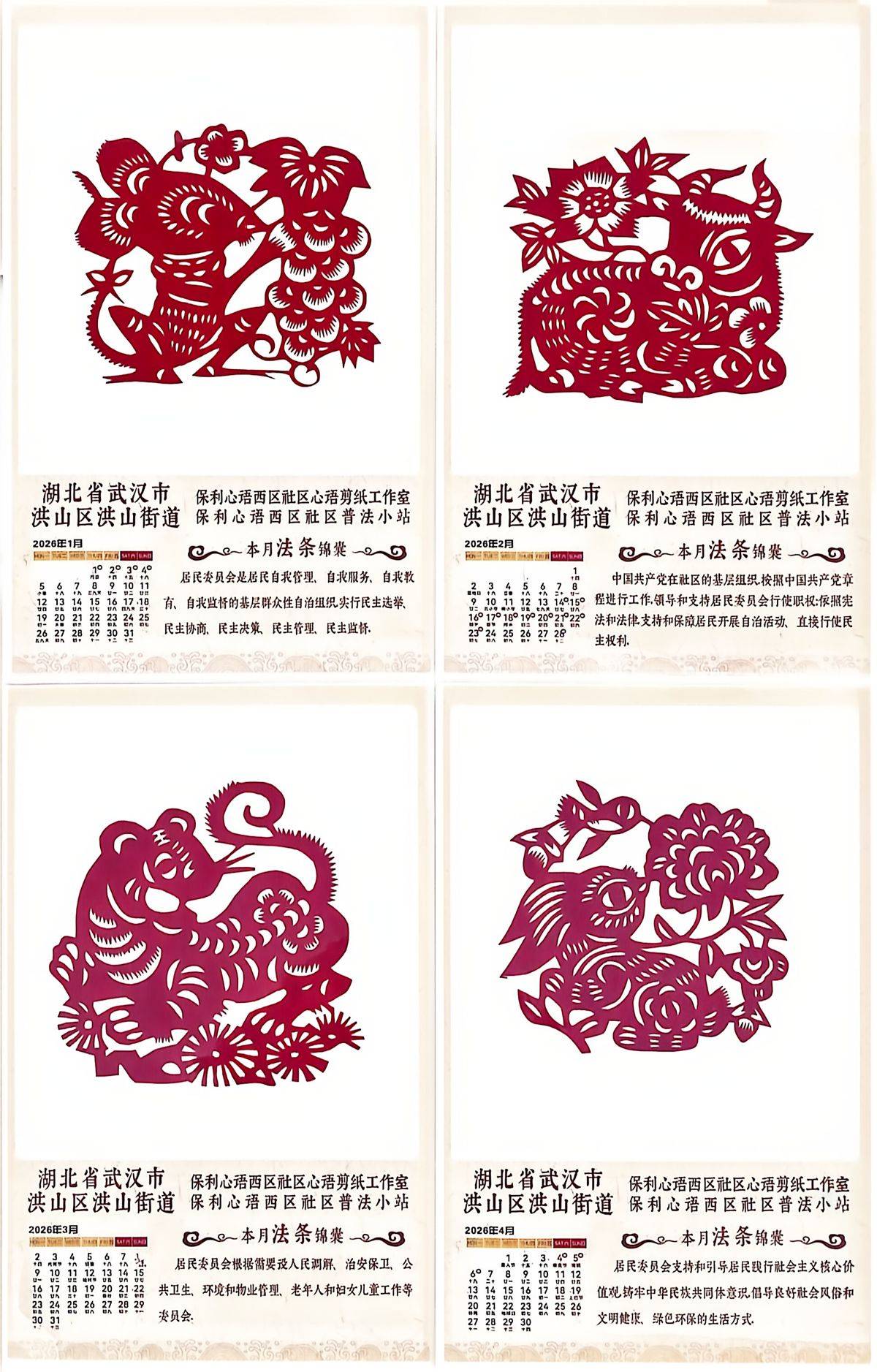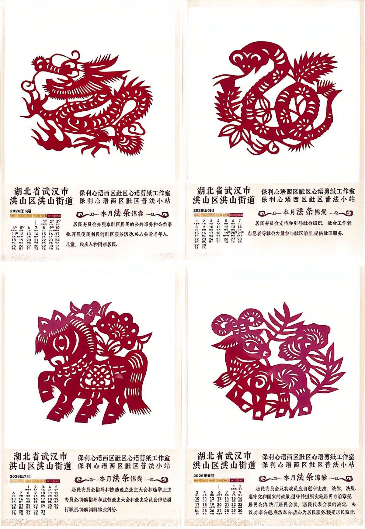 本期展示的是武汉市洪山区保利心语西区社区心语剪纸工作室、普法小站共同创作的“十二生肖来普法”系列非遗剪纸法治日历作品。作品将传统文化与普法宣传深度融合,把“两法”普法宣传融入非遗剪纸日历创作之中,一剪一镂传文脉,一页一日悟法理,非遗雅韵浸润心灵,法治理念相伴同行,让遵法守法意识悄然扎根社区,让法治宣传更具温度、更接地气,绘就文化传承与法治建设相融共生的美好画卷。