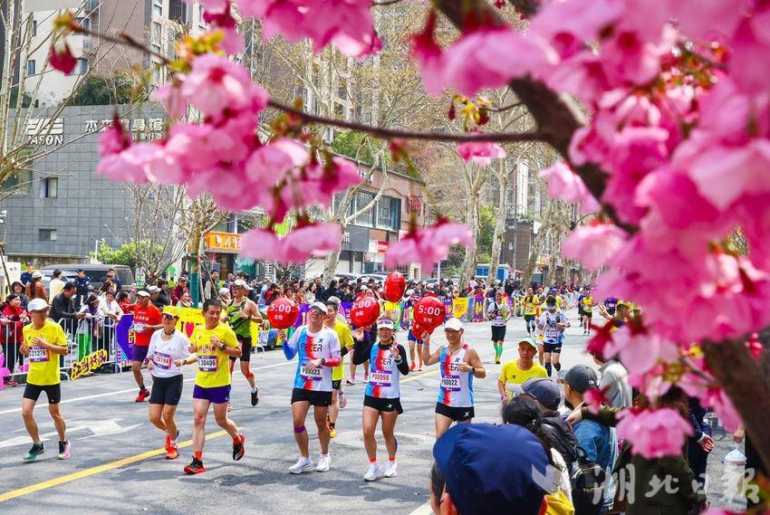 3月22日,参赛选手从建设三路樱花树下跑过。(湖北日报全媒记者 柯皓 摄)