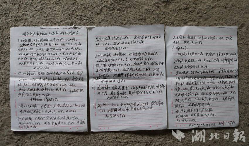 最初的几年,他每年只养20多箱蜜蜂,每天天不亮就上山巡检,天黑才回家,仔细记录每一箱蜜蜂的状态,及时调整蜂箱位置、补充饵料。