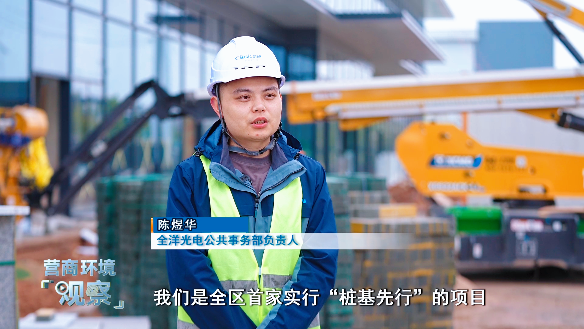 全洋光电公共事务部负责人 陈煜华:我们是全区首家实行“桩基先行”的项目,预计的话,是今年6月份正式投产(5月份试产)。得益于“桩基先行”对我们的优惠政策,我们这块项目会提前两个月完成,这样能保证我们8.6代金属掩模板产品早日投放市场,能够保持我们公司在金属掩模板行业的领先地位。
