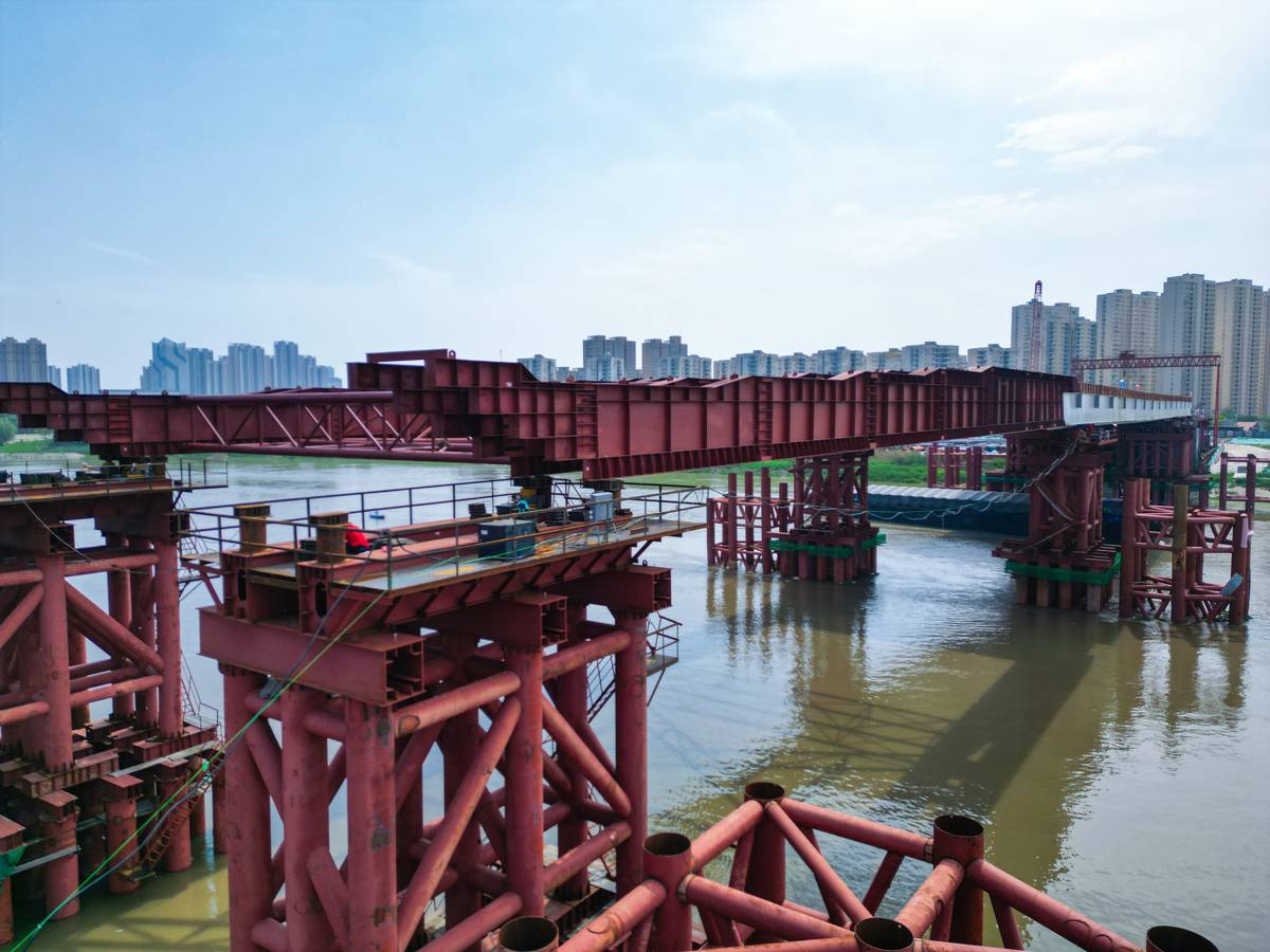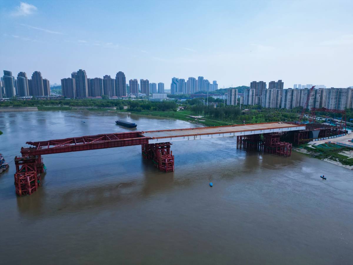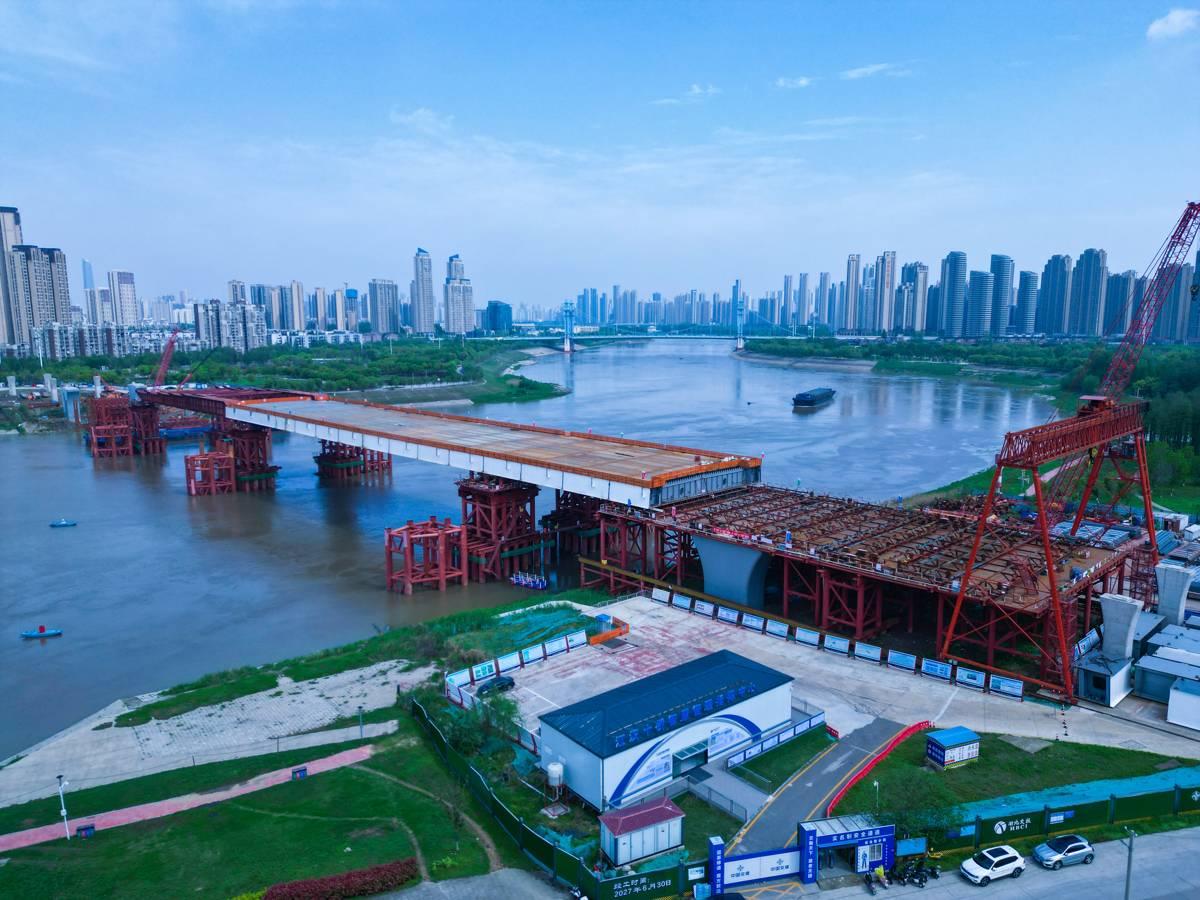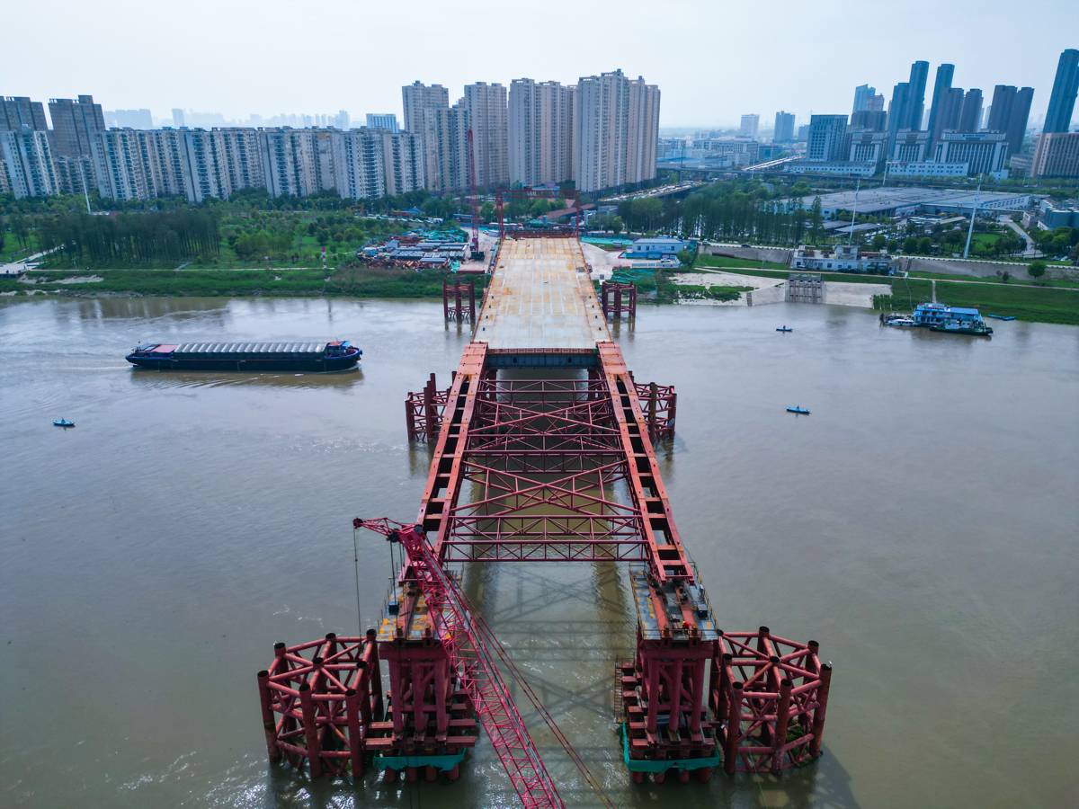 江汉十桥是武汉市规划的第10座跨汉江通道,也是一座钢拱桥,主桥以钢质杆件组合而成,主桥用钢约1.7万吨。主跨380米,其中钢箱梁采用步履式顶推法施工,最大顶推跨径达120米,顶推规模位列国内第二。该桥采用“先梁后拱”施工工艺,中交二航局项目技术团队采用智能应力监测系统,对临时墩沉降、钢箱梁线形进行毫米级精度控制,确保结构受力均衡。