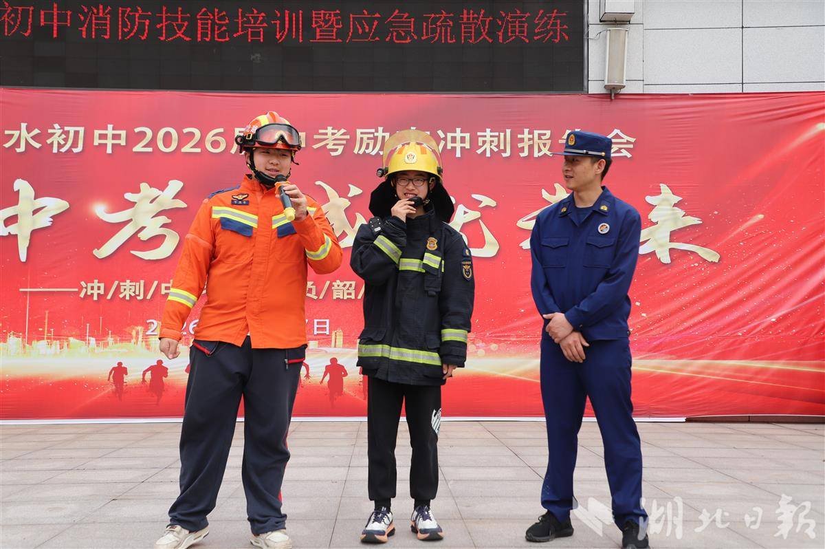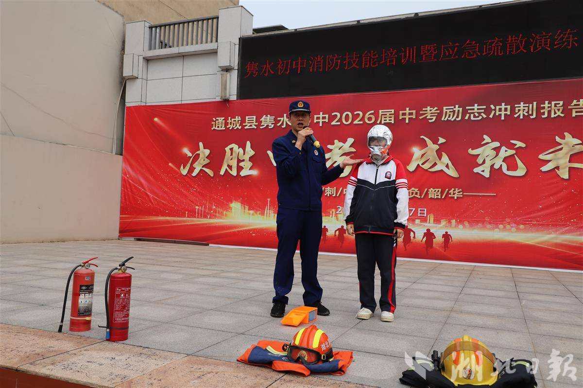 湖北日报讯 (记者童晨曦、通讯员董帅、黎丹)“呜——”近日,随着一声急促而尖锐的消防警报声在校园上空骤然响起,咸宁市通城隽水初级中学全体师生跟着消防员共同开展应急疏散演练活动。