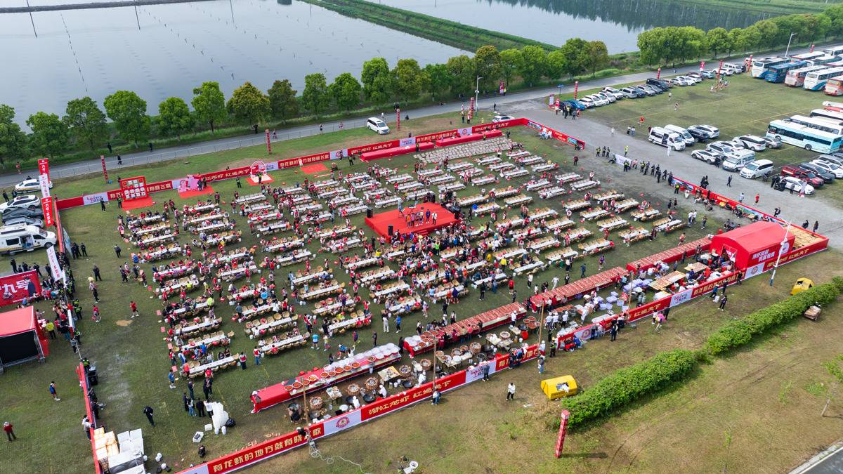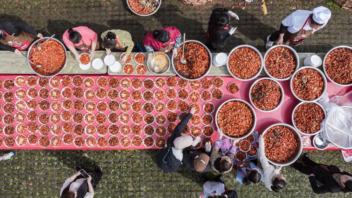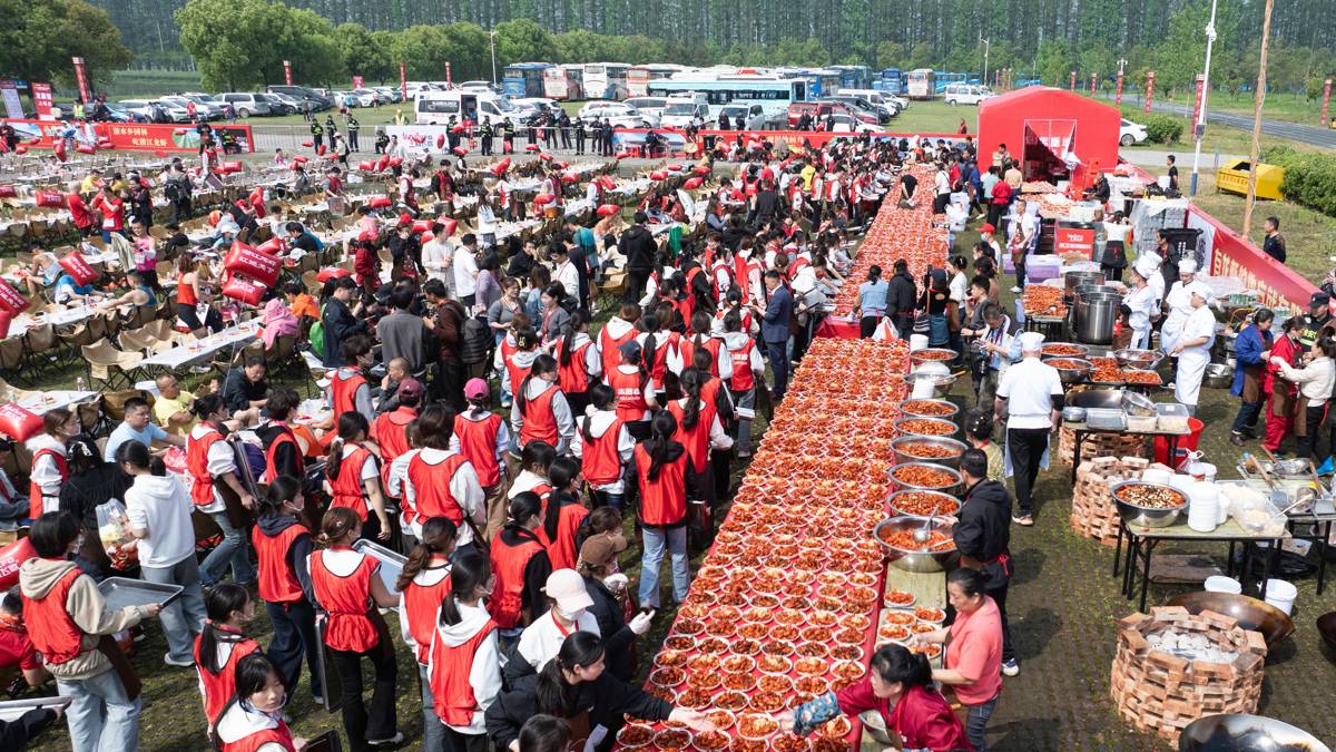 2026年4月12日,2026潜江返湾湖半程马拉松鸣枪开跑,吸引6000余名跑者前来参跑。在马拉松终点处,一场由10吨小龙虾烹饪而成的龙虾盛宴,让完赛跑者们大饱口福!(湖北日报全媒记者 何宇欣 摄)
