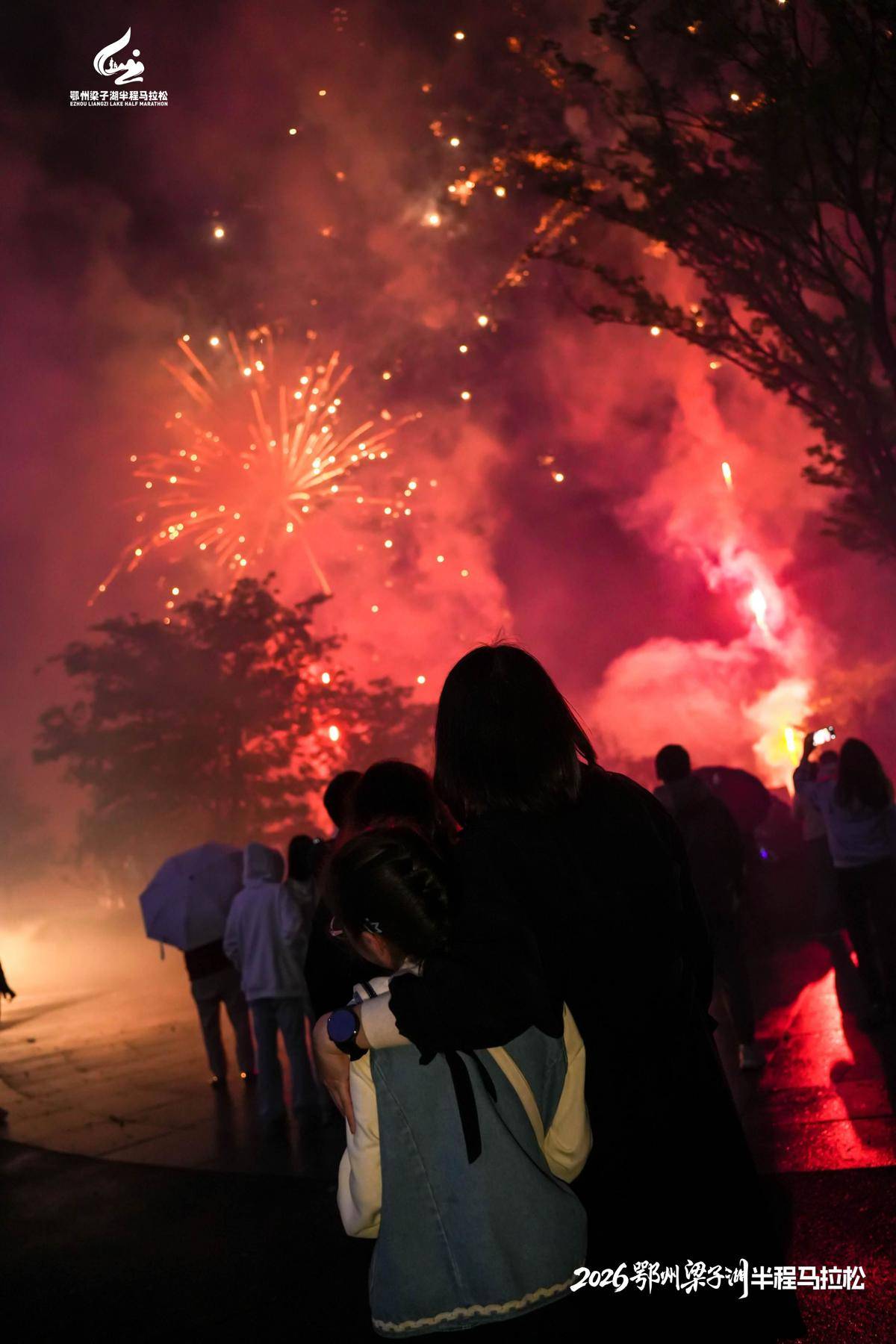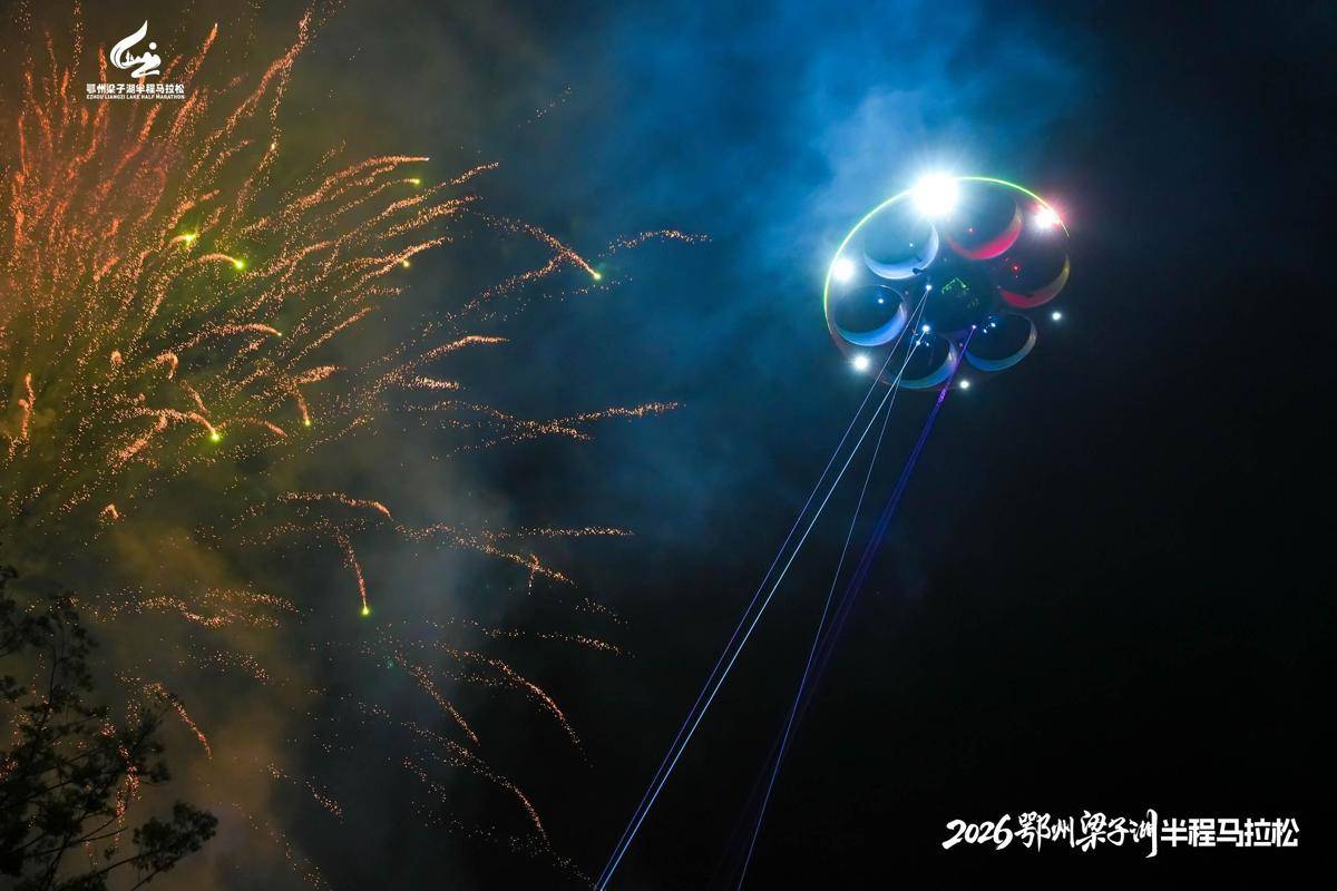 赛事不仅在白天竞速中融合生态与文旅,更将文体旅体验延伸至比赛前夜。4月11日晚,一场融合“飞碟灯光秀”与“璀璨烟花秀”的视觉盛宴在凤栖绿洲生态文明博览园上空精彩上演。“巨型飞碟”升腾而起,绚丽的激光秀燃爆现场,科幻感十足,与漫天烟花交相辉映。这场光影盛宴不仅为跑者营造了热烈的赛前氛围,更成为梁子湖区以赛事为媒介、激活夜间经济、丰富文旅业态的创新实践,进一步放大了“体育+文旅”的叠加效应。