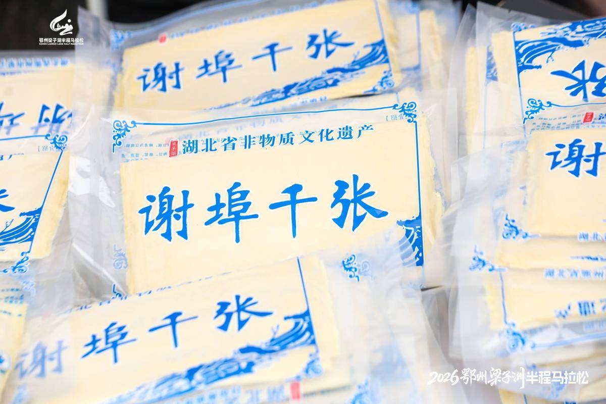 赛前领物环节,选手们收到了精心准备的梁子湖文创产品和谢埠千张等本土非遗美食,提前感受梁子湖的文化温度;赛事当天完赛区则设有特色美食站,提供本地小吃,让跑者在冲线后第一时间品尝“梁子湖味道”,治愈身体与心灵。