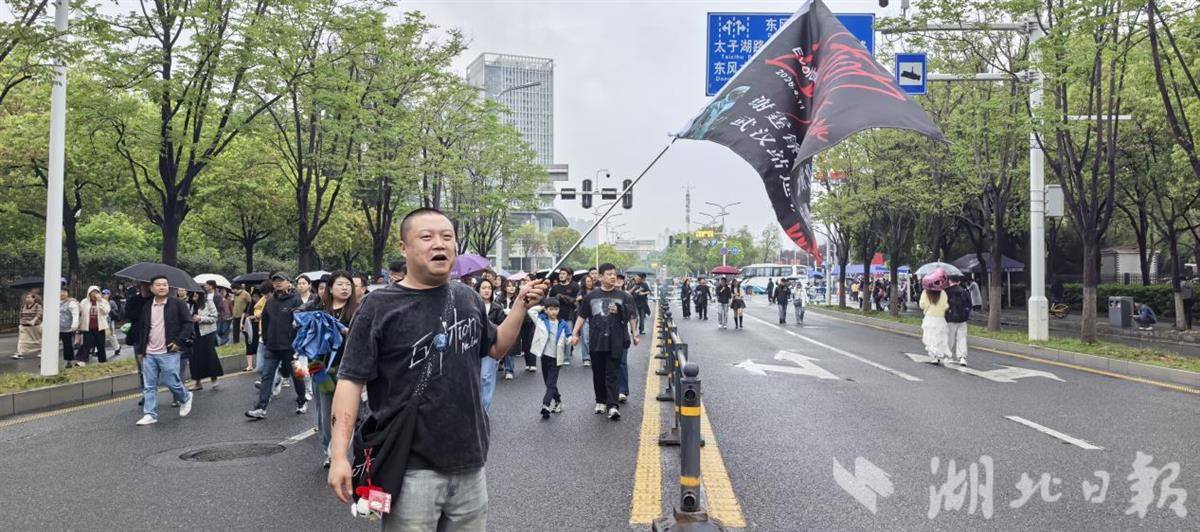 4月11日,来自荆州的谢霆锋歌迷黄先生举旗赴约。(湖北日报全媒记者 甄子萱 摄)
