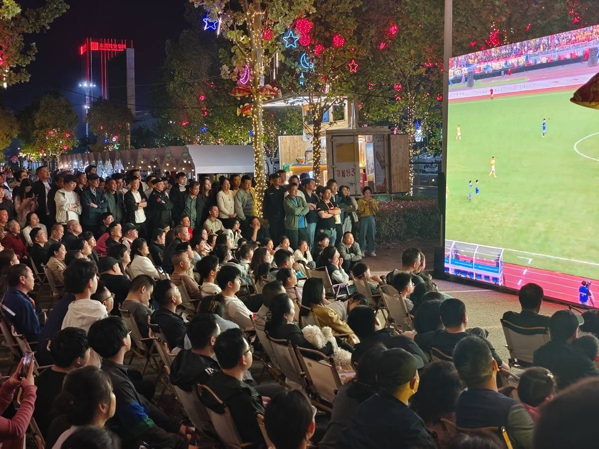 黄石奥体中心体育场外,球迷在大屏幕前观看比赛直播。(湖北日报全媒记者 柯皓 摄)
