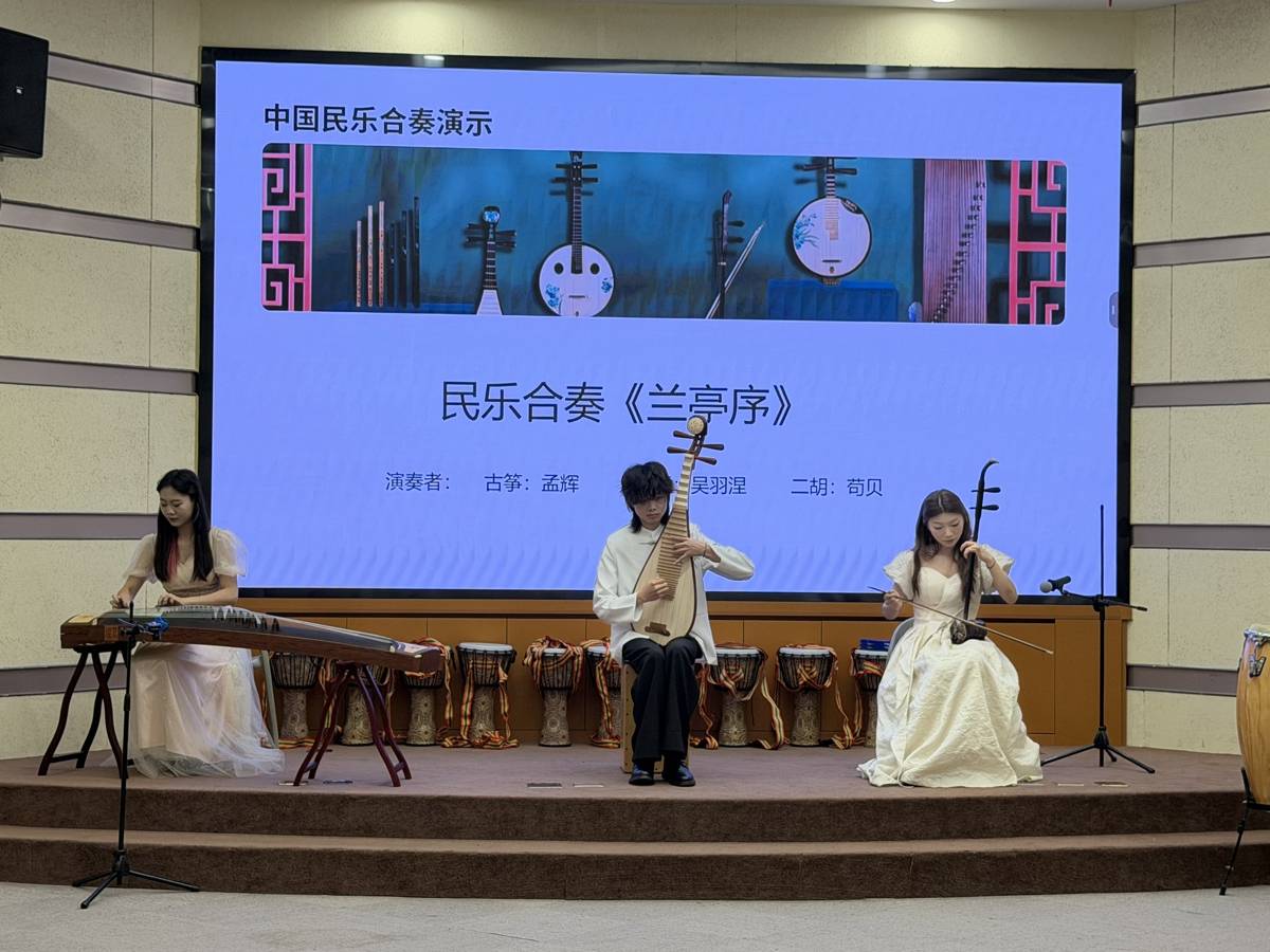 专业表演团队带来高水准演绎:民乐合奏《兰亭序》婉转悠扬,古筝、琵琶、二胡的默契配合,完美诠释中国民乐“支声复调”的韵味与留白之美;西洋乐器四重奏《City of stars》节奏明快,萨克斯、长笛等乐器的和声交织,尽显西洋音乐的理性结构与和声厚度;《西部主题畅想曲》以古筝搭配非洲鼓演奏,中式古韵与非洲原始律动碰撞融合,迸发别样的音乐火花;《世界赠予我的》由萨克斯与吉他联袂演绎,轻柔旋律中尽显中西乐器合奏的和谐之美。每场演奏前后,嘉宾均进行专业导赏,细致讲解乐曲创作背景与艺术特色,让读者既“听得见”更“听得懂”不同风格的音乐作品。