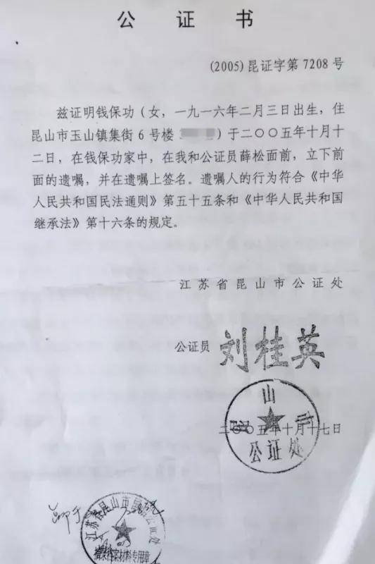 钱保功遗嘱公证书。
