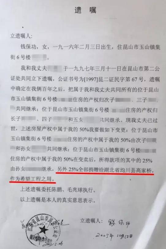 2005年,89岁的钱保功身体日渐衰弱。她瞒着所有子女,悄悄立下一份特殊遗嘱:将名下房产出售所得款项的四分之一,捐赠给均县高家桥村(现丹江口市均县镇罗汉村),用于希望工程。这份遗嘱还进行了公证。
