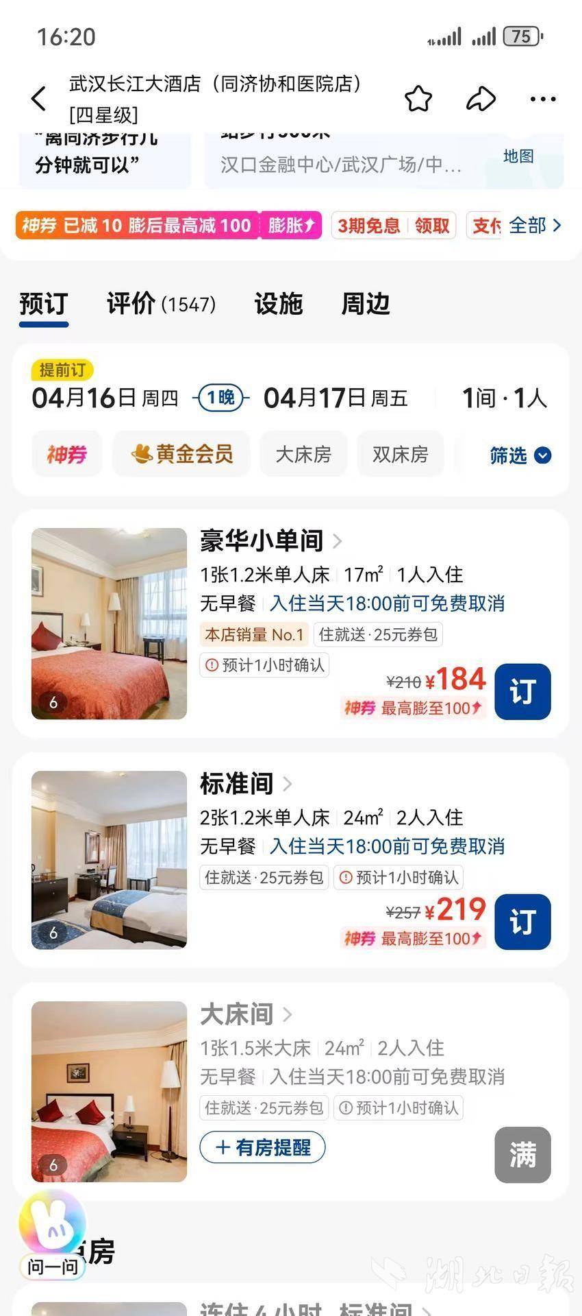 酒店前台告诉湖北日报全媒记者,酒店目前能正常预定,随定随住,单间每天184元,标间219元(价格美丽,想打卡的小伙伴速来)。店方工作人员也接到了片区更新的通知,但对停业拆改何时开始并不清楚。