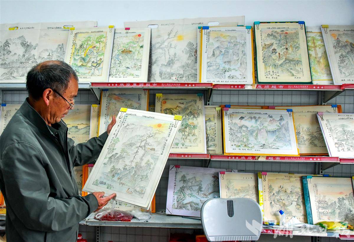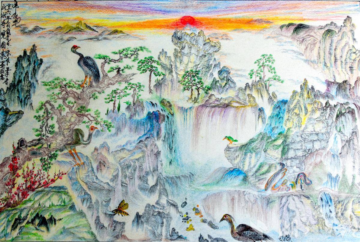 这一画,老陈却放不下手中的画笔了。特别是2019年11月重病出院,老陈再不能干体力活了,除了干点力所能及的家务,一有空闲就在门前坐在树下画自己创意的彩铅画,并对过去画作时不时进行修改,如今,家中餐厅北面一面墙上,摆放着他的60多幅彩铅画,没事的时候他就在画前细品每一幅画,哪一幅缺少布局,他都进行认真思考,并请家人和亲朋好友进行点评。