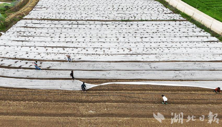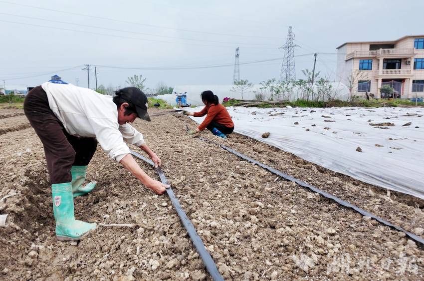 4月12日,记者来到堰下家庭农场,农户们分工协作,正在架设水管、铺设地膜、覆土压实,有条不紊地开展黄蜀葵种植作业。