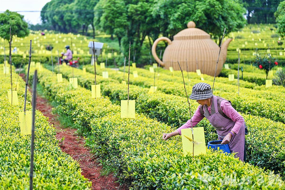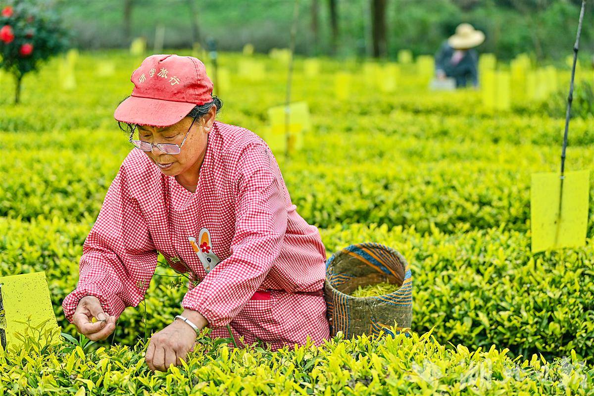 4月13日,村民正在采摘武汉市江夏区青龙山林场郑家山茶场里的黄金茶。