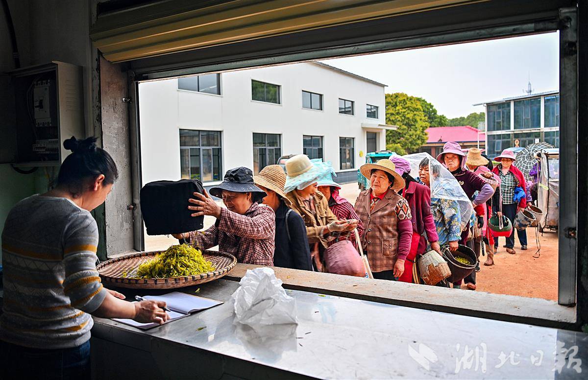 4月13日,在武汉市江夏区青龙山林场郑家山茶场里,村民正在称自己采摘的黄金茶。